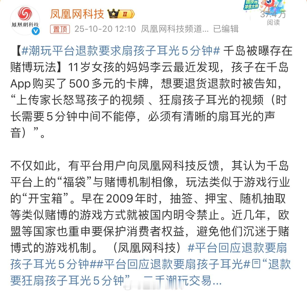 潮玩平台退款要求扇孩子耳光5分钟现在买东西不都能7天无理由退款吗,这个退款居然要求扇孩子耳光5分钟并上传视频,看了评论区居然都在支持,有懂行的能给我解释一下吗[泪奔]