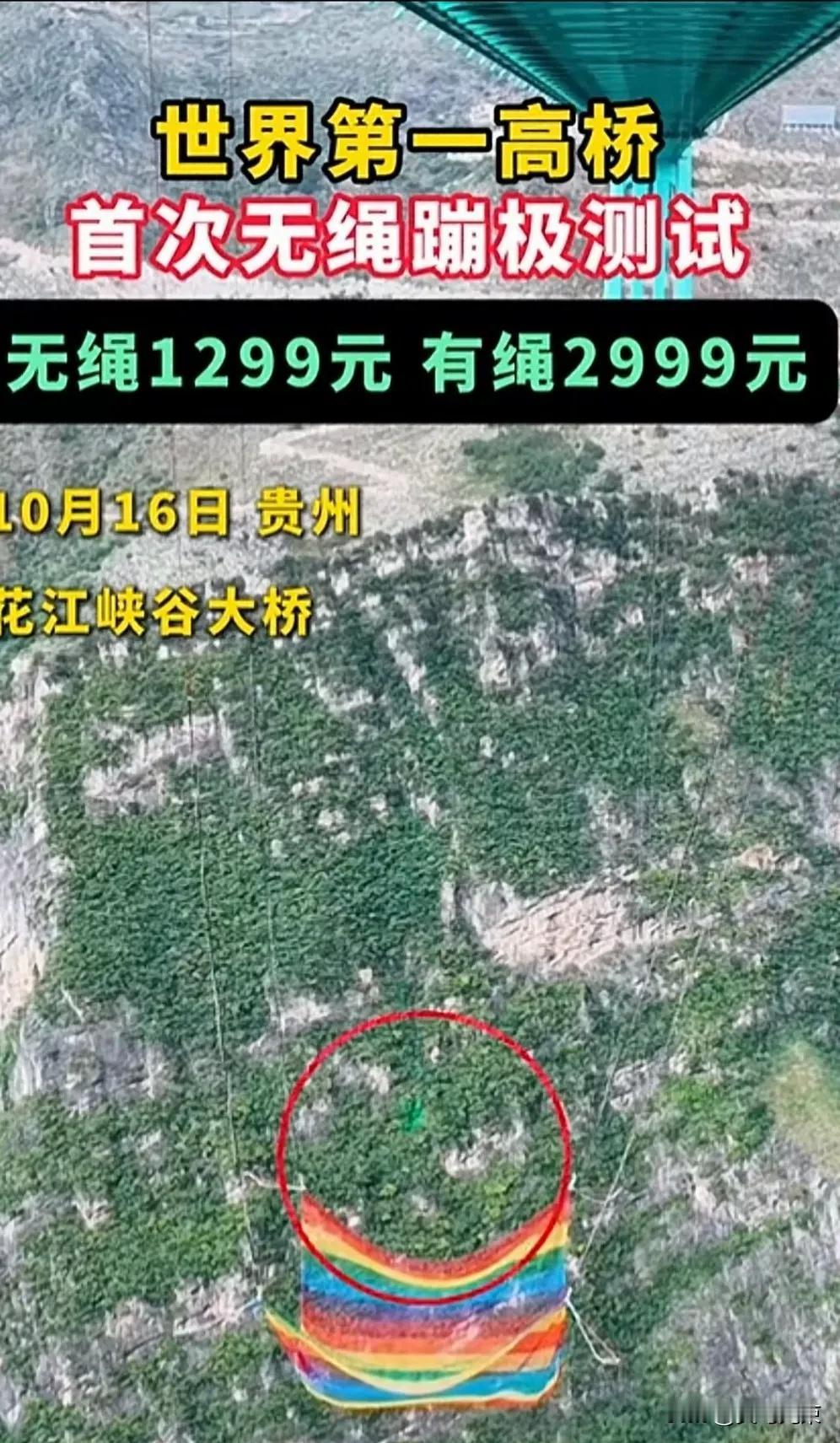 花江峡谷大桥玩命新花样,胆小勿入。 贵州花江峡谷大桥,最近搞了个大新闻,大家都知道了吧,就是那个无绳蹦极,真的假的,很多人都在问,就在那座桥上,风景倒是挺好,看着就腿软。 从桥上直接往下跳,没有任何绳子,下面有个网,听说桥到谷底六百多米,网离桥面几十米,想想就可怕,有绳的蹦极要三千块,这个不要绳反而便宜,只要一千多,这,怎么想,怎么不对劲。 有人说这是花钱玩命,这话糙理不糙,确实有点吓人,肯定有人觉得刺激,想去试试,但是安全问题,谁能保证,这个项目,以后会怎么样,很难说啊,大家都在看。