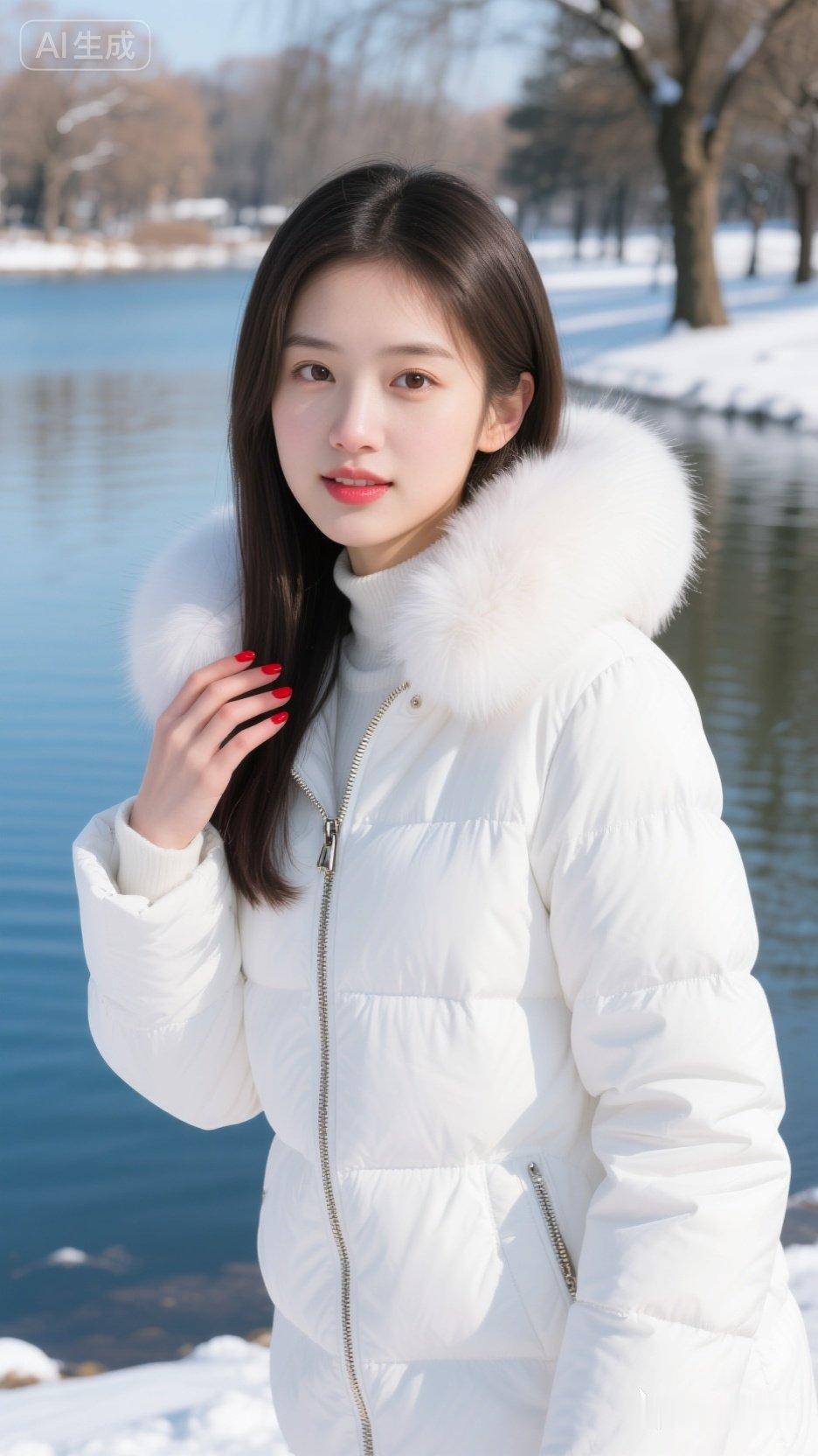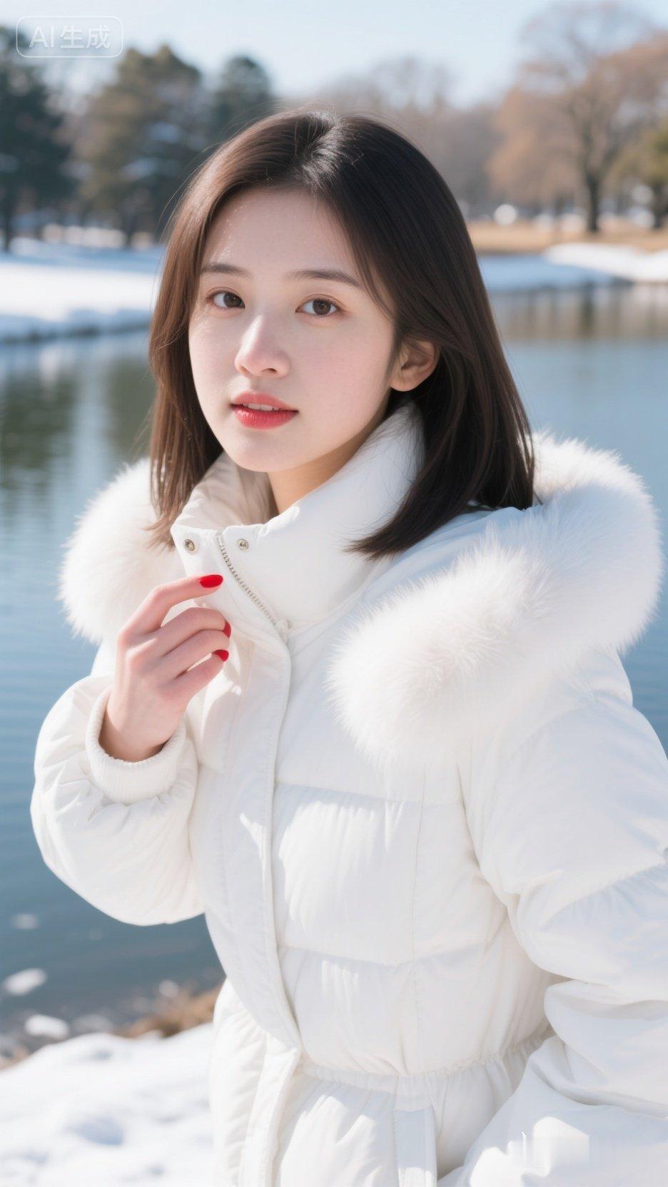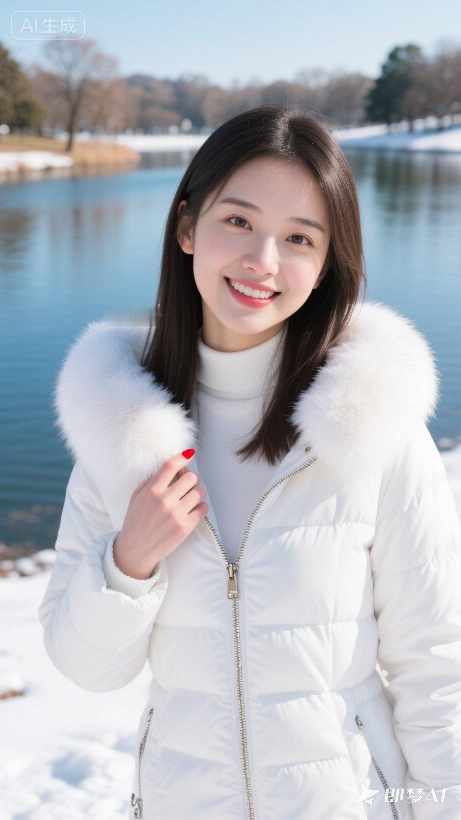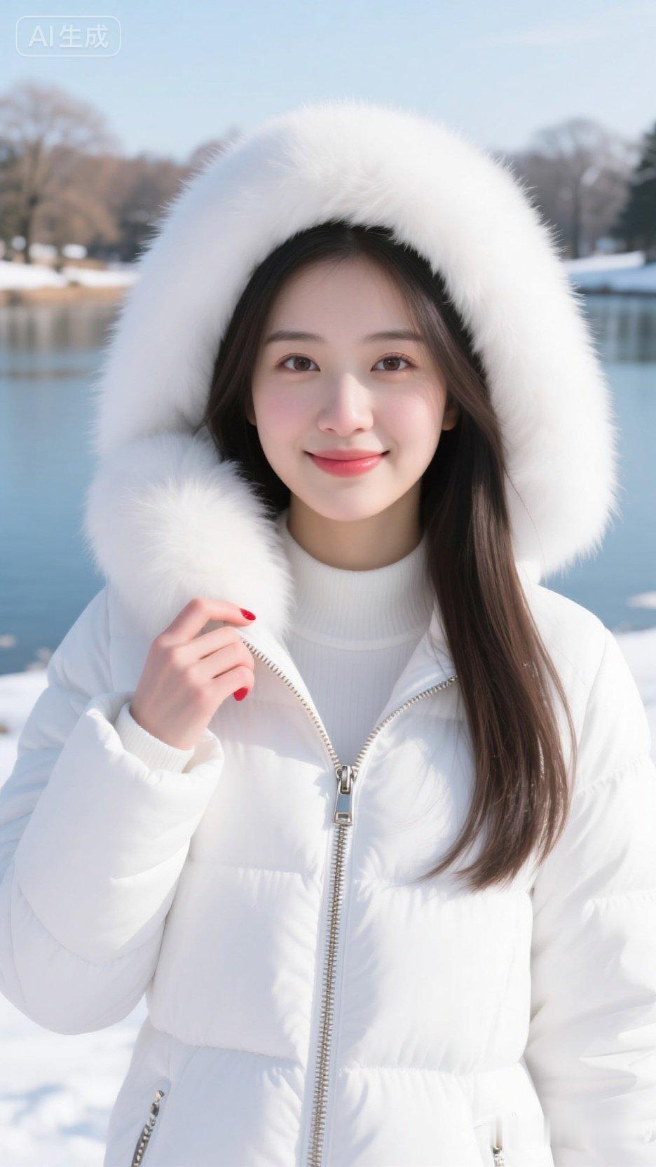 冬日暖阳下的甜美笑容,白色羽绒服与雪景相得益彰。🌞💕