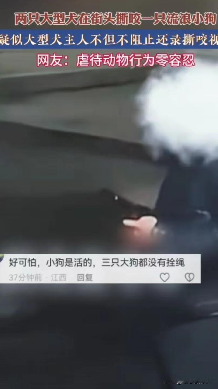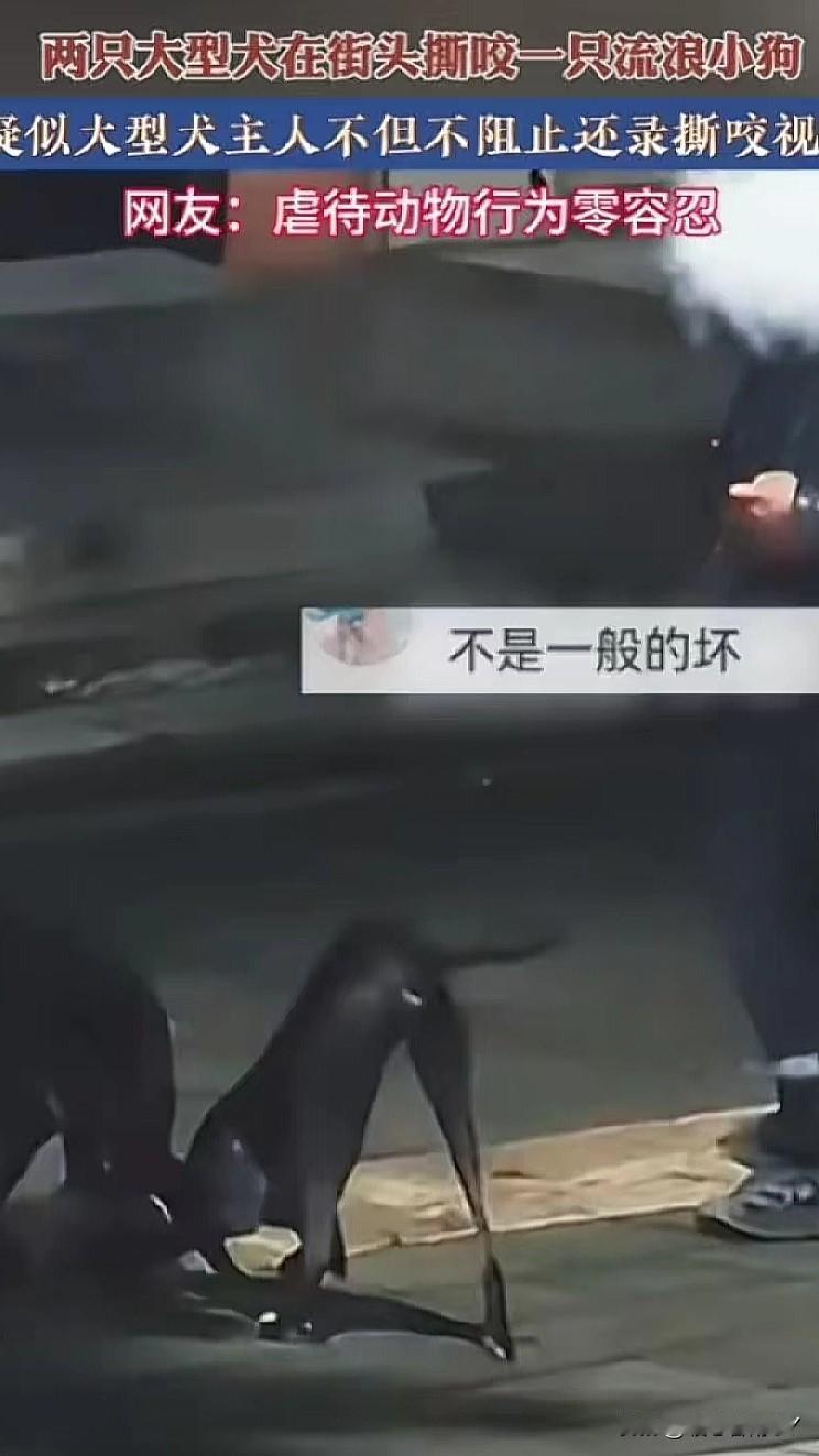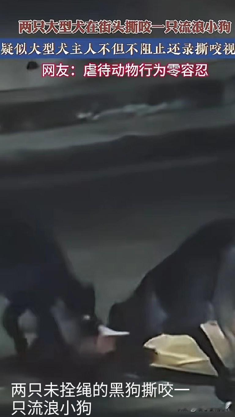 河南漯河街头大型犬撕咬流浪小狗事件:网友直呼对虐待动物零容忍。 2025年10月12日,河南路和街头这事,真让人愤怒,深夜里两条黑色未拴绳的大型犬在街头对一只流浪小狗发起撕咬,场面较为激烈,更让网友不满的是,疑似狗主人的黑衣男子,不仅没有上前阻止,还掏出手机在一旁录制撕咬视频,对流浪小狗见死不救。 这是啥样的心态?许多网友认为,这种放任甚至记录动物受伤害的行为属于虐待动物范畴,纷纷留言表示:“对虐待动物行为零容忍”。 狗狗之间的撕咬本来就很残酷,而主人这种冷漠态度让人气不打一处来。 流浪小狗本身就可怜,还遭遇这样的伤害。 网友呼吁零容忍是对的,养宠物就得有责任心,不能让自家宠物为所欲为,漠视生命的人真该好好反思。 规范养犬人的责任与行为,防止类似伤害再度出现。