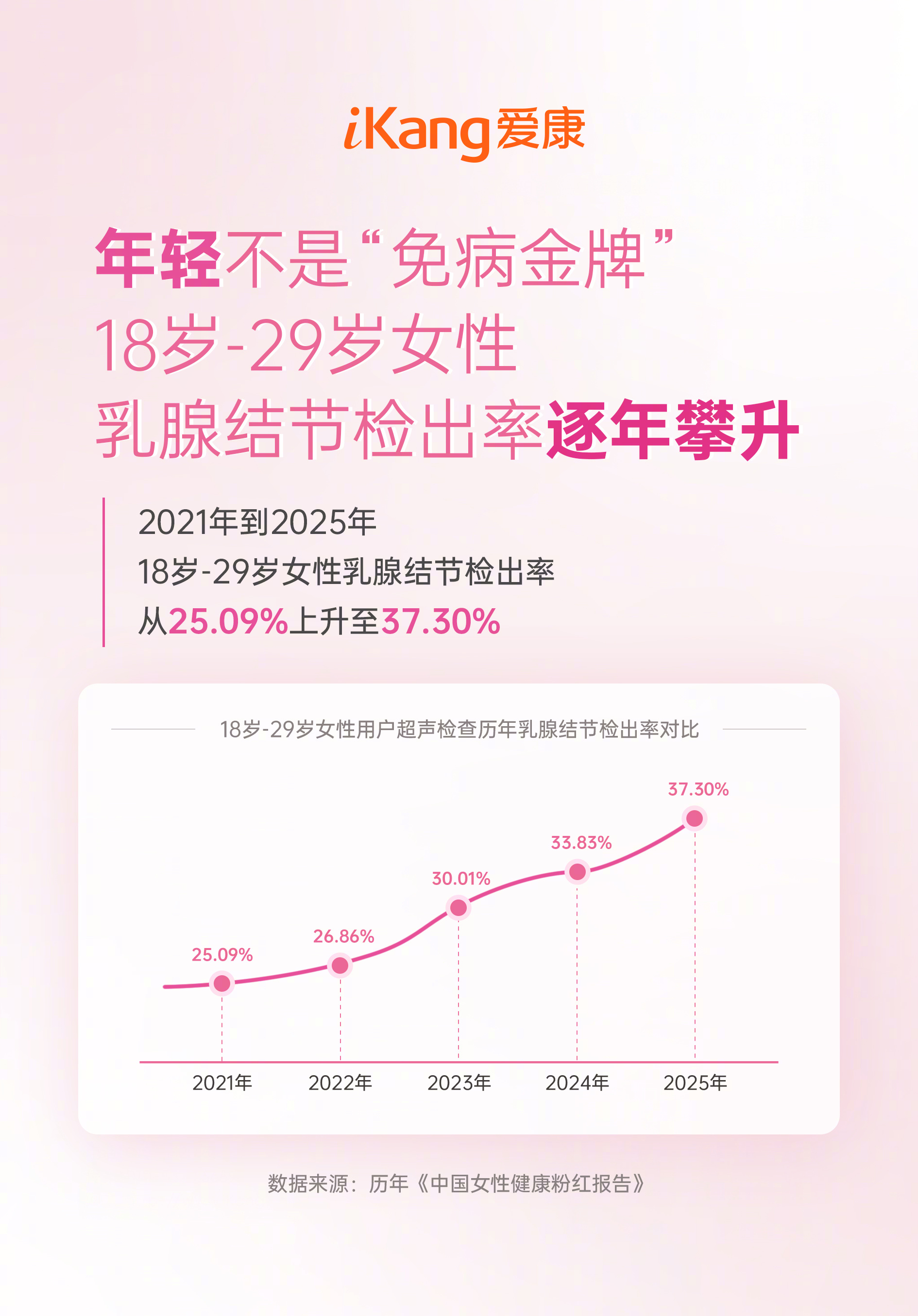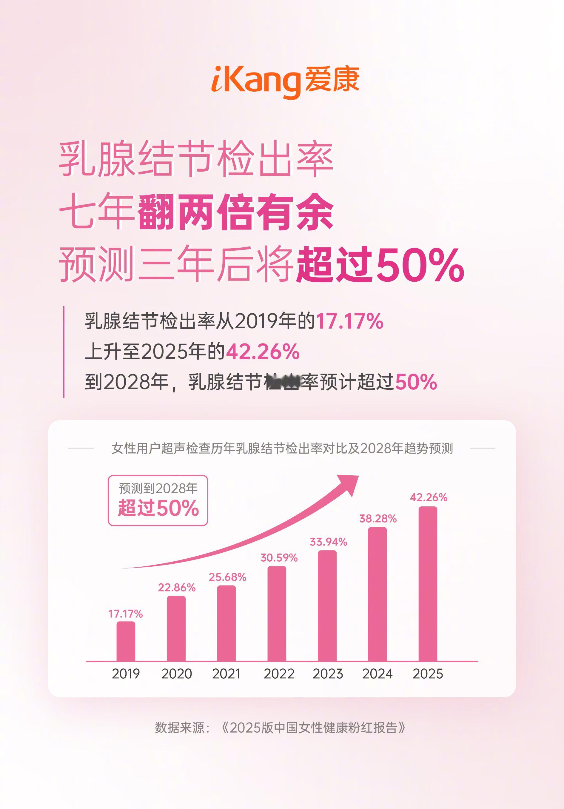超六成女性乳腺出现增生,四成以上检出结节——七年内增长超过一倍。40-49岁女性更是已经达到了53.12%,而18-29岁的年轻女性,乳腺结节检出率在短短五年间上升了12个百分点。乳腺疾病的风险正在悄然靠近每一位她。