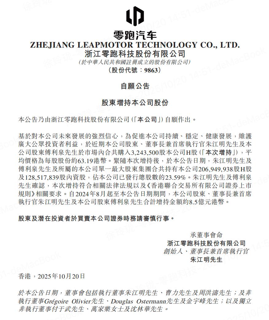 朱江明再增持零跑股票,“长期主义”具象化? 据最新消息披露,零跑创始人朱江明及