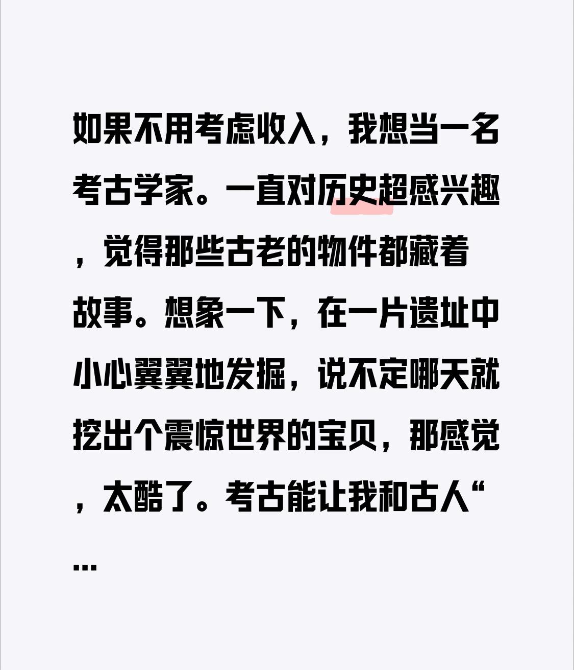 如果不用考虑收入,我想当一名考古学家。一直对历史超感兴趣,觉得那些古老的物件都藏着故事。想象一下,在一片遗址中小心翼翼地发掘,说不定哪天就挖出个震惊世界的宝贝,那感觉,太酷了。 考古能让我和古人“对话”,了解他们的生活、文化。每次解开一个历史谜团,就像完成了一场超刺激的冒险。而且,考古工作还能去很多地方,感受不同地方的风土人情。不用为了赚钱而工作,单纯为了热爱,去探寻历史的真相,想想都觉得美好。