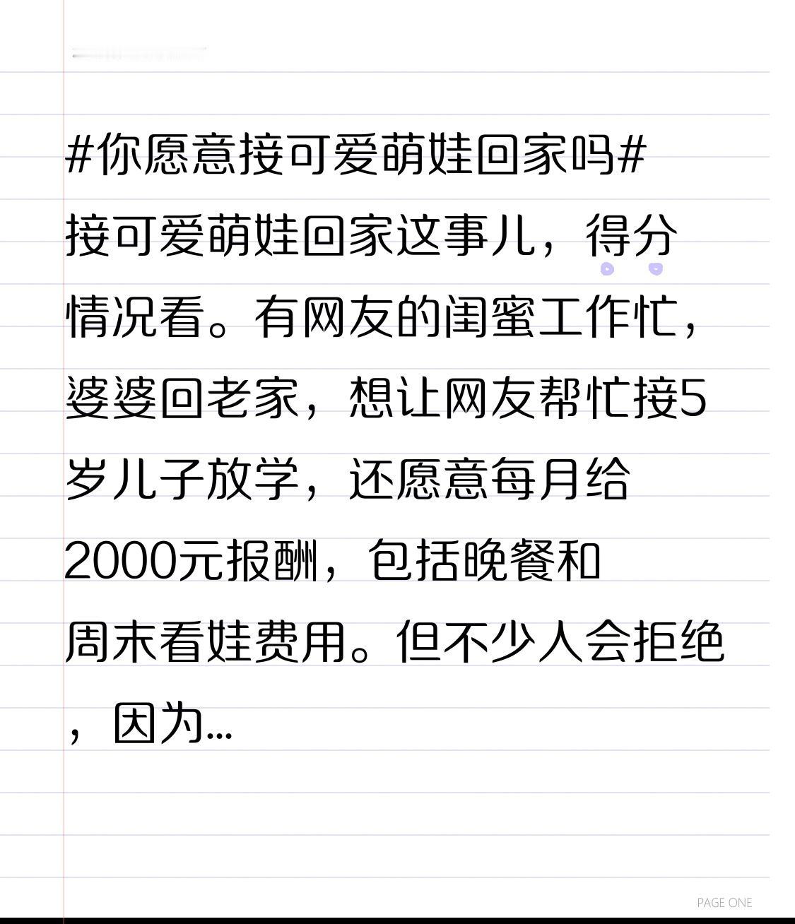 接可爱萌娃回家这事儿,得分情况看。有网友的闺蜜工作忙,婆婆回老家,想让网友帮忙接5岁儿子放学,还愿意每月给2000元报酬,包括晚餐和周末看娃费用。但不少人会拒绝,因为拿了酬劳成雇佣关系,带娃得万分仔细。 还有宝妈纠结早产宝宝要不要接回家。宝宝19号出生,在新生儿科上了五天呼吸机,现在三斤半,吃30多毫升,身体各项还好就是长得慢。家人想抱回家吃母乳,不过还是得咨询医生,毕竟孩子太轻,身体各项数值可能还没达标。