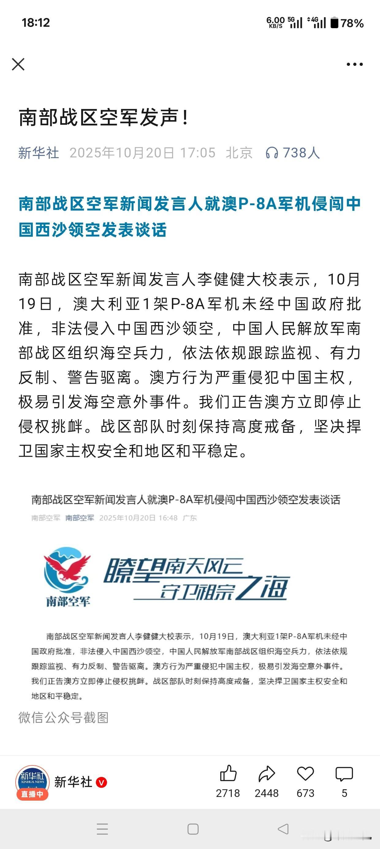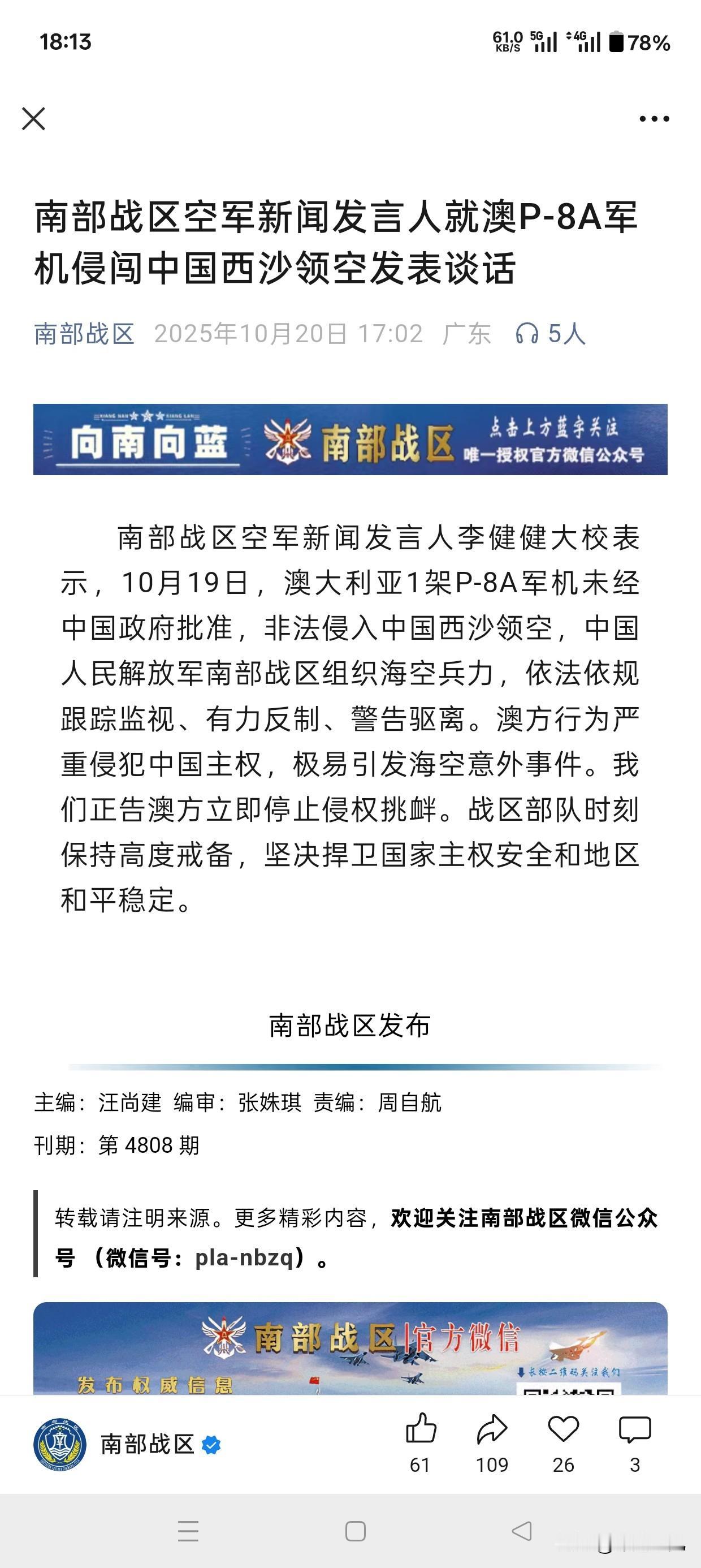南部空军出手啦,驱离澳大利亚P-8A侦察机,又来碰瓷儿? 澳大利亚军机未经允许,非法侵入我国西沙领空,南部战区海空兵力强力驱离,一架P-8A,“袋鼠儿”又来碰瓷儿侦察,好日子又不想过了,看来万吨大驱遵义舰环澳一圈,还是没让它长记性啊,记吃不记打呗,目前,没有透露驱离具体细节,按照咱家的节奏,未来某一天,会公布相关细节! 这下好了,等着吧,是时候,安排055,再去袋鼠家溜达一圈了,真是不知道自己几斤几两啊,大家等着看吧! 大家怎么看?评论区说说!