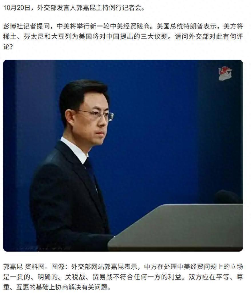 还没见面,特朗普提出三个条件,要求中方满足,中方回应很直接 中美之间的“见面谈判”,总是少不了点悬念和火药味。新一轮经贸高层磋商眼看就要开场,特朗普却还没等双方坐到一张桌子上,就隔空甩出了稀土、芬太尼和大豆这三道“必答题”,直接要求中方先表态。 气氛刚拉满,中国外交部也是没兜圈子,立刻亮明“平等、尊重、互惠”的底线。桌子还没摆好,双方的牌已经摊在明面上,这场博弈,谁都不打算让步。 特朗普这次直接把稀土摆上了牌桌,说白了,美国这两年在高科技和军工领域对稀土有多依赖,行业里都心知肚明。 全世界七成以上的稀土加工都靠中国撑着,美国想自己搞,但短时间根本折腾不起来。尤其是在芯片、导弹这些领域,稀土断供就等于卡脖子,谁都明白这点。 眼下,美国既想保证稀土供应,又不想受制于人,于是就想让中国先打个包票,别搞出口限制。 中国的回应却很直接:稀土是我们的资源,想怎么管理那是自家事儿,既然是国家安全、可持续发展的需要,当然要有自己的规矩。 其实美国也清楚,自己产业链单一才是症结,不能总想着让别人给你兜底。稀土问题和表面上的生意买卖不同,背后藏着的是技术主导权的明争暗斗。 中国有底气把稀土当筹码,就是希望美国在高科技领域别再搞小动作,放宽点限制,大家你来我往才是正道。其实,稀土这点事,归根结底,是两国高科技博弈的缩影,谁也别想着吃独食。 再说芬太尼。美国国内阿片类药物泛滥,政客们总爱把锅甩到中国头上,说中国管控不严,让芬太尼和前体化学品流到美国。 特朗普的条件很简单,要求中国“彻底切断”这条链子,还要加强执法配合。中国这边可没惯着,早在几年前就率先大规模列管芬太尼相关物质,实际行动摆在这儿了。 中方也不客气,直接点出这问题是全球性难题。美国国内药品管理混乱、滥用处方药才是真正的深层原因,光靠堵外来渠道远远不够。 其实明眼人都能看出来,美国在这事上有点“自家屋里失火,还怪隔壁没给水”。中国愿意合作,但不买“政治甩锅”的账。 大豆贸易就更是老生常谈了。贸易战说打就打,结果美国农民直接遭了殃。中国原来是美国大豆的最大买家,一旦加税,南美大豆立马成了香饽饽,美国大豆却被晾在仓库里。 特朗普眼看着农民选票要飞了,着急让中国恢复采购,还把这事说成“经济敌对”。中国的逻辑直接明了:是谁先加的税?市场行为摆在这,买谁的大豆更划算就买谁的。 要想让中国继续买单,美国得先把不合理的关税撤了,讲求互惠才有得谈。 中国有庞大的市场,说不买就不买,美国农业带的政治压力反倒成了特朗普的心病。贸易战走到今天,谁挑头谁负责,解铃还须系铃人。 三个条件,三场较量,桌面下的较劲比明面上更激烈。中国的回应从头到尾没变过,只有平等、尊重、互惠这几个字。 特朗普的条件说白了,正好暴露了美国在关键领域的短板,急得他想让中国先让步。中国这回没吃哑巴亏,也没绕弯子,把立场亮出来,自己手里有牌,不怕被人牵着鼻子走。 看这架势,美国到底是愿意丢掉单边思维,坐下来好好谈,还是还想玩“交易的艺术”,极限施压?全世界都等着看。 说到底,谈判桌上只有平等交流才有出路,老想着一边倒,最后只能两败俱伤。 参考资料:特朗普将稀土、芬太尼和大豆列为中美经贸磋商的三大问题,中方回应 2025-10-20 15:38·观察者网
