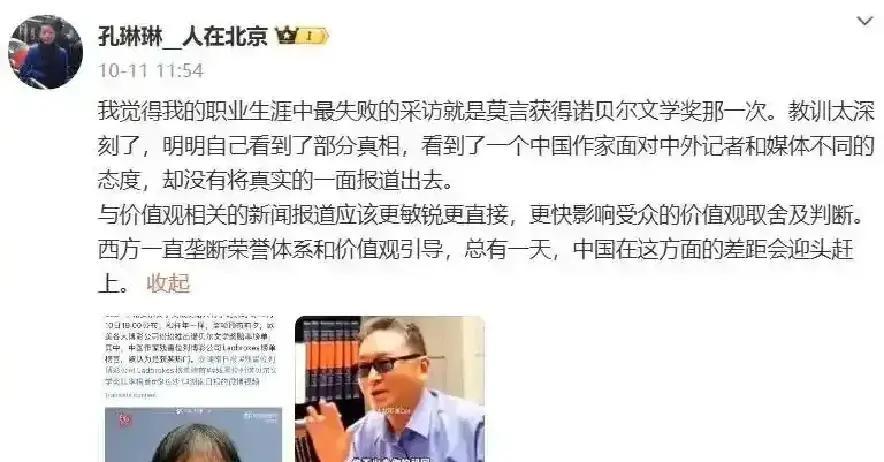 央视主持人的一条社交媒体消息引发关注,她称自己职业生涯最大的失败就是对莫言获得诺奖后的采访,自己明明看到了部分真相,却没有将真实的一面报道出去。 她始终记得当时的场景,那是她第一次近距离采访这位刚刚荣获诺贝尔文学奖的作家。莫言端坐在采访室里,他的神态看起来很平静,但眼神却隐隐流露着一丝复杂情绪。她一开始没有细想,只是按部就班地提出了一些比较常规的问题,比如他的创作灵感来源,以及关于家乡高密的成长经历问题。他没有避讳,谈起了自己在高密的一些记忆——那片土地给予了养分,但也留下了深深的压抑。他的话语间透露着感慨,更带出了一种复杂的情感。 当镜头关掉,话题稍稍脱离了采访内容时,她才发现莫言的情绪远比表面更加复杂。他突然谈到了一些国外媒体对他的评价,声音平稳中藏着几分不满。“他们认为我写的东西是受限的,说是那种‘高度政治化’的文学。他们根本不了解情况。”莫言轻声说着,眼神中似有些疲惫,“我的文字也许受过影响,但它们最终是我自己的表达,是我的文化,是我这片土地给我的东西。” 孔琳琳隐约意识到自己挖掘到了一个更加真实、更有深度的话题——关于一个作家内心的博弈,也关乎东西方审视的视角之差。但她也敏锐地觉察到,这种表述或许会触及某些敏感的神经。她原本想追问下去,但转念一想,作为一名媒体人,她需要考虑现实的环境和极为复杂的舆论氛围。于是她选择了放弃,保持了采访内容的“浅层安全”。回到编辑室,她对采访进行了剪辑,将那些可能引发争议或者展现莫言私人情绪的部分一一剔除,只保留了他对文学创作的浅显阐述,这在当时是最保险的办法。 在后来反复回看这段采访时,她心中感到深深的歉疚。她知道她记录到的莫言并不是全貌的莫言,不是那个在镜头背后说话更加真实、更加坦诚的作家,而是一个被过滤后的版本。他的那些挣扎、他的创作的真正意义,以及他面对国内外文坛的态度,她没有呈现出来。作为媒体人,她违背了一种职业的初衷,违背了约定俗成的报道精神。 最近,她偶然整理旧视频资料时,再次翻出了那段采访。对比如今的自己,她已经走过了很多年时光,无论对新闻的认知还是对作家的理解都已经成熟许多。她突然感受到一种沉甸甸的责任,媒体的报道关乎公众对一个人的认知,甚至会塑造历史对他的评价。而她错过的那一次机会,既是对莫言的失职,也是对观众的辜负。 也许今天,她在网上提到这段往事,就是一次自我和解,也是一次公开的道歉。她无意炒作,只想表达自己曾犯的错误,希望年轻的媒体人不要重蹈覆辙。她希望未来可以有更真实的报道、更深刻的对话,让公众和历史看到一个更加立体的人,一个被时间切割每一面的书写者。 这条社交媒体消息引发了广泛讨论,其中有人支持她的坦诚,认为她为行业发展注入了一份反思的力量,也有人质疑她的动机,甚至批评她为何不早一步坦白真相。但无论如何,孔琳琳愿意向过去的自己致歉,同时提醒所有手握话筒和摄像机的人,新闻的灵魂不应该只是包装,而是呈现真相。这是她工作多年的一个深刻教训,也是一份迟来的成长