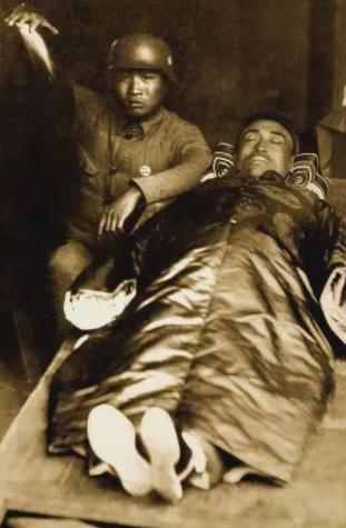 1937年,淞沪会战,杨杰将军的最后遗容。照片中杨杰将军躺在一块木板上,头上戴着