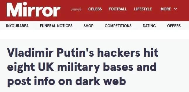 【暗网英雄】 10月19日,《每日镜报》报道,俄罗斯网络犯罪分子袭击了英国八座军事基地。受影响的设施包括莱肯希思空军基地,该基地部署了F-35战斗机,且可能储存有核武器。 只要不是英媒恶意栽赃陷害, 信息是正确的, 那么就充分说明在另一条战线上, 俄罗斯对搅屎棍——英国 展开了报复行动。 借助乌克兰战争, 英国的所作所为, 的确令俄罗斯咬牙切齿, 不要颜色, 也许不是一些俄罗斯黑客的风格。 虽然他们被英国冠以网络犯罪分子, 但也许在俄罗斯人眼里, 他们就是名副其实的暗网英雄。