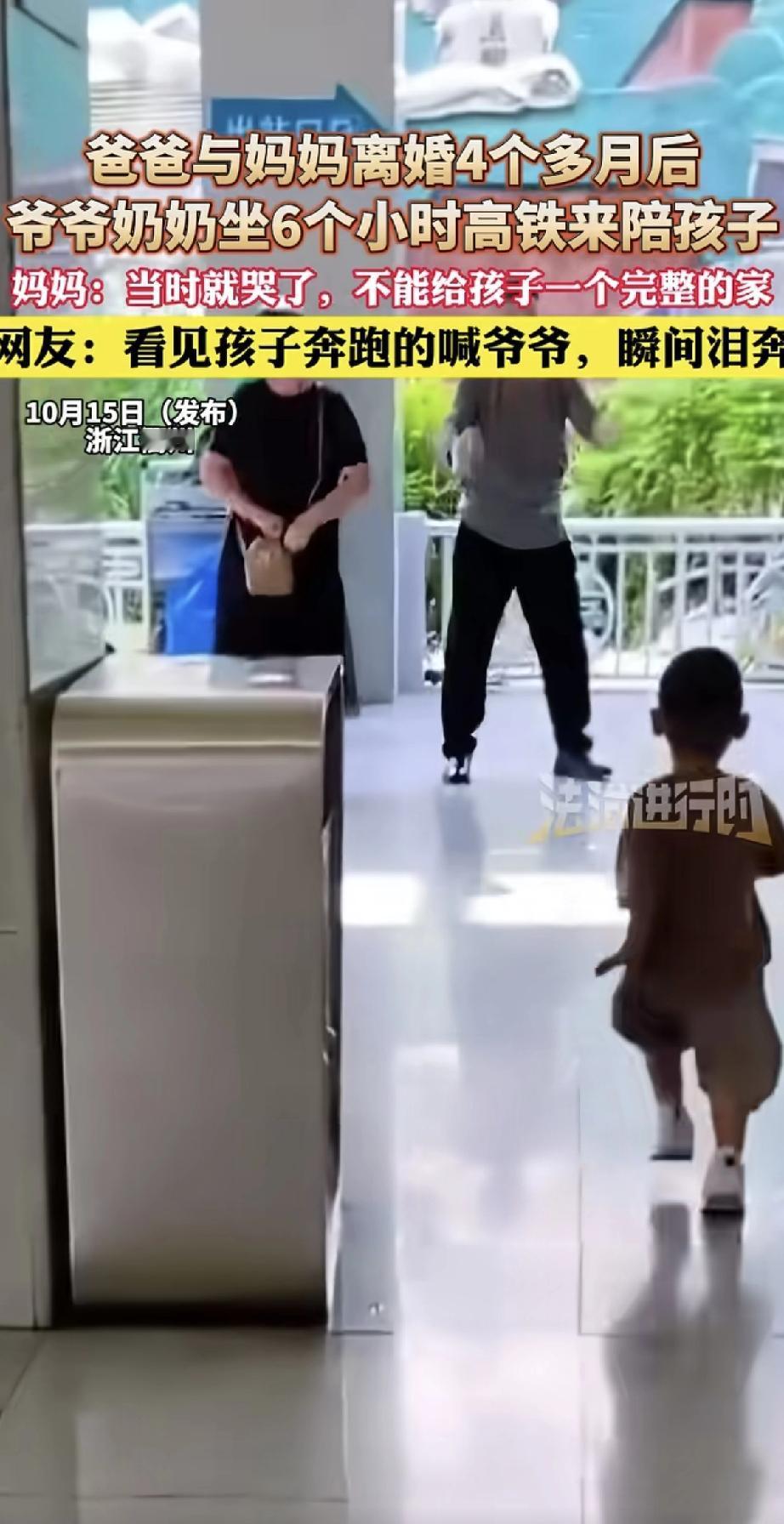 离婚四个多月后,爷爷奶奶坐了6小时高铁专程来看孙子。孩子远远看到爷爷,激动地飞奔