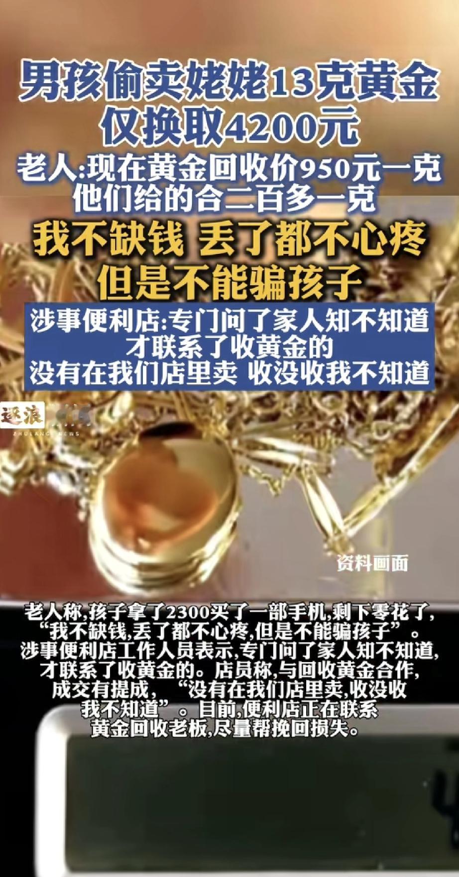 这孩子太不懂事了!偷偷把姥姥的13克黄金拿去卖,结果只换了4200元。老人说现在金价每克950元,这相当于被压到了三百左右一克。 姥姥心疼的不是钱:“我不缺钱,丢了都不心疼,但是不能这样骗孩子!” 便利店承认帮忙联系了收黄金的,成交还有提成。目前正在尝试联系回收方,尽量帮老人挽回损失。 贵重物品家长要收好,也要给孩子树立正确的金钱观。