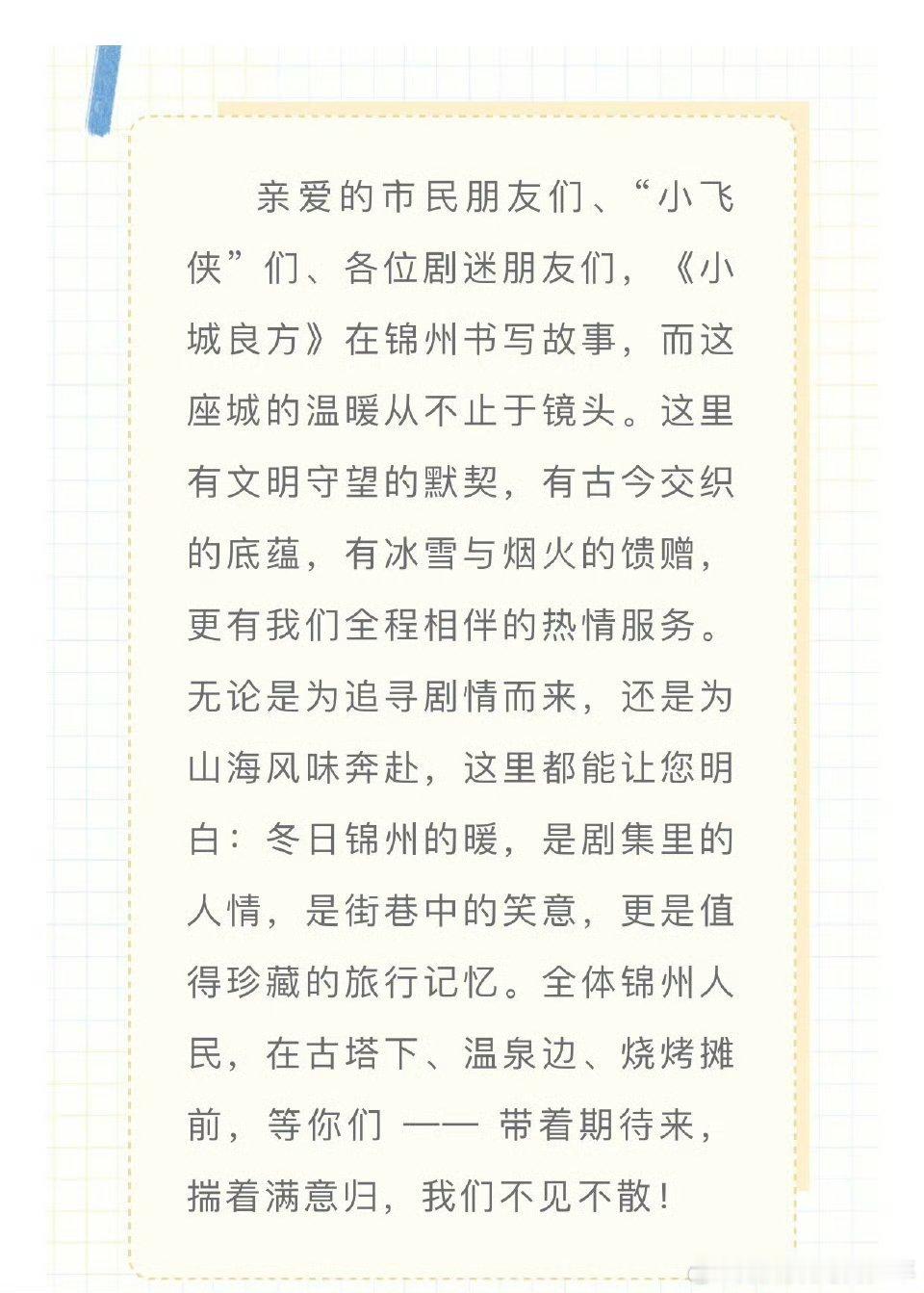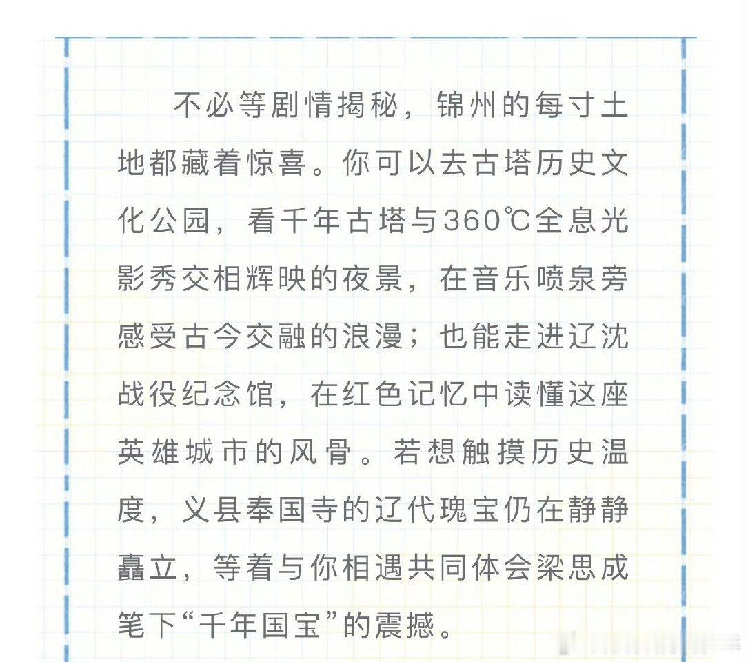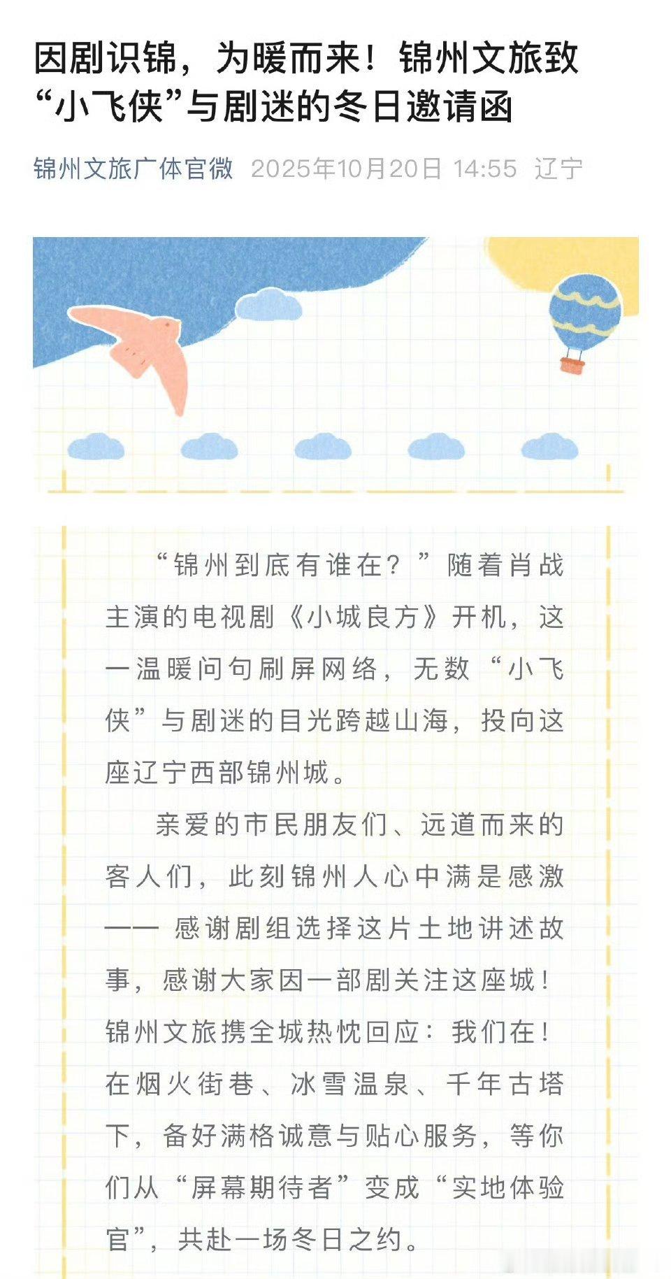 肖战一个人带火一座城,“因一部剧,识一座城”!锦州再邀请函,热情邀请肖战粉丝小飞侠剧迷们去锦州,感受大美锦州[送花花][送花花]体验古今交织的底蕴!