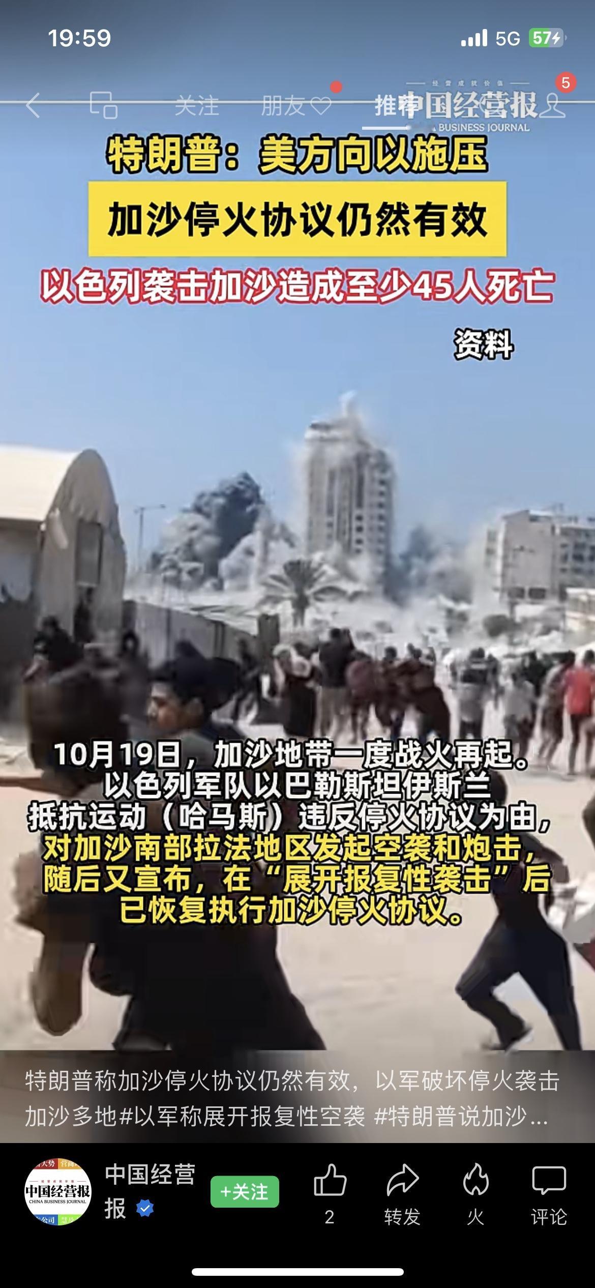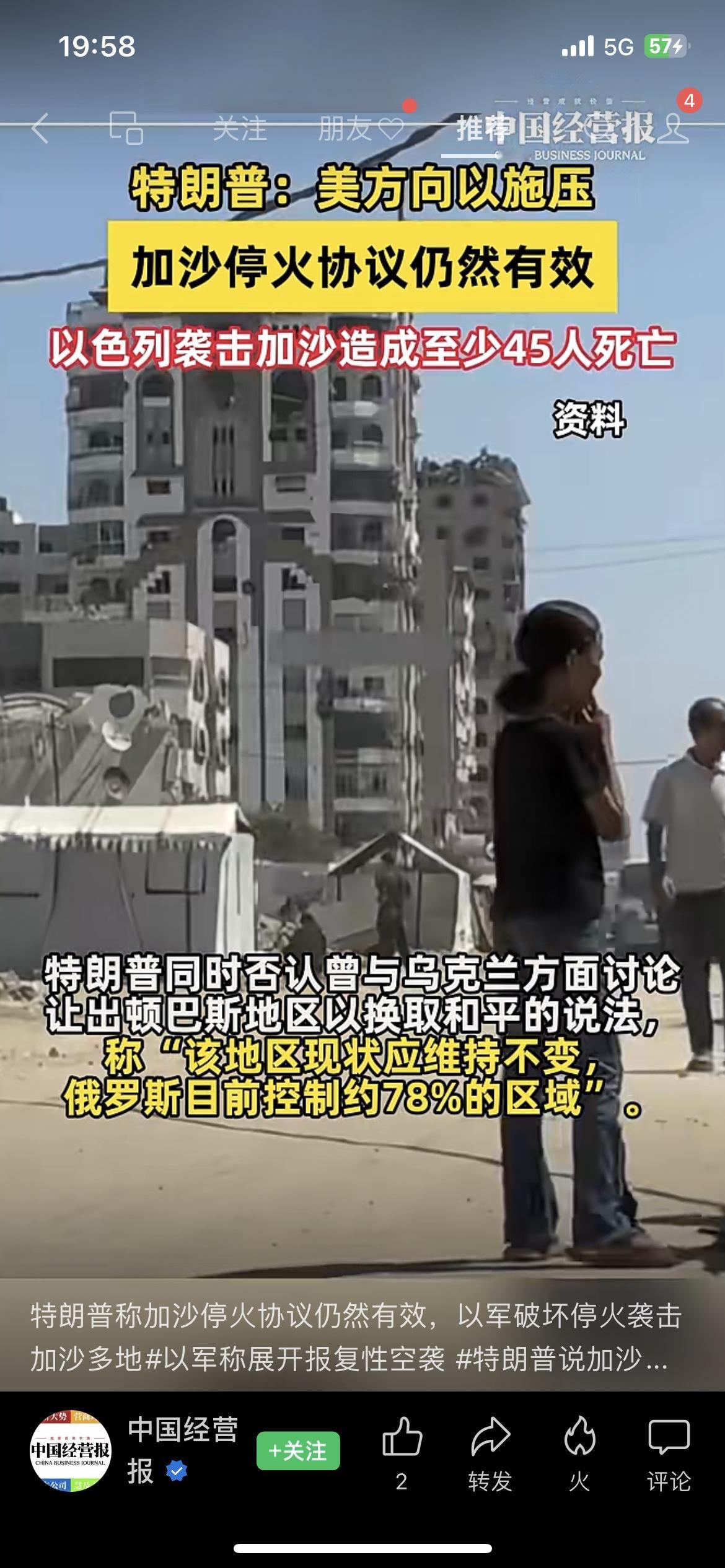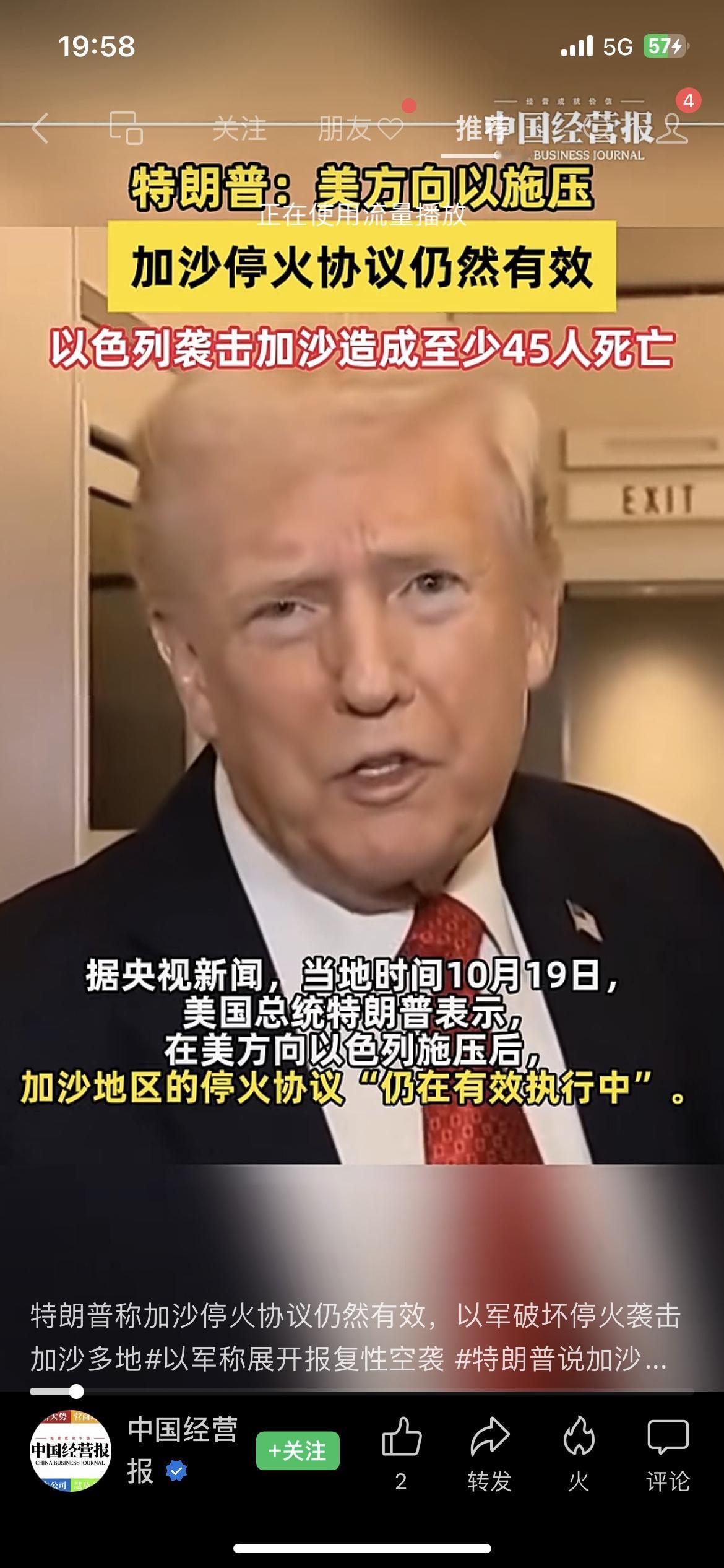 特朗普说加沙停火协议有效,以军却炸得加沙至少45人死亡 特朗普表态美方向以施压,强调加沙停火协议仍然有效,但以色列袭击加沙已造成至少45人死亡。 10月19日加沙战火又起,以军以哈马斯违反停火协议为由狂轰滥炸,随后又宣称恢复执行停火协议。前脚说停火协议有效,后脚就炸出45人死亡,加沙这局势把全球都看懵了。加沙地带的现状
