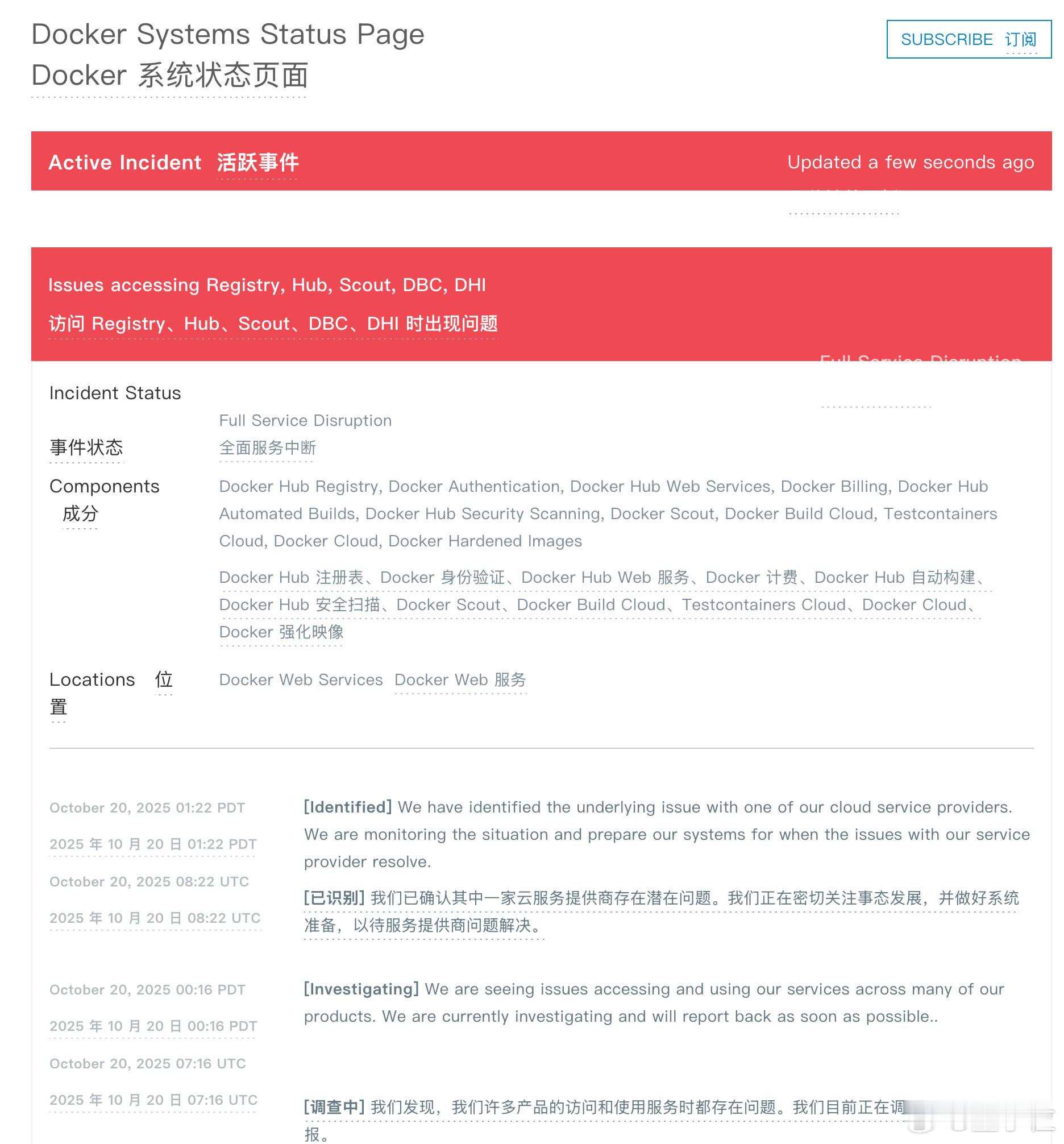 根据状态页信息,Docker目前怀疑是“某家云服务提供商”出问题。