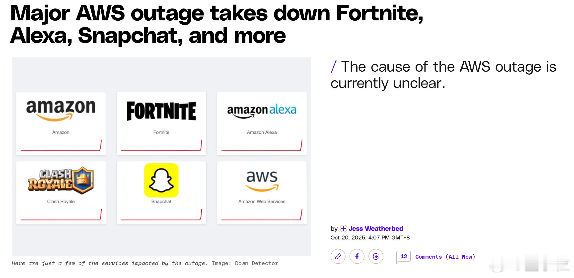 TheVerge确认,故障发生在美国东部us-east-1区域,是AWS全球服务最核心的一块。
