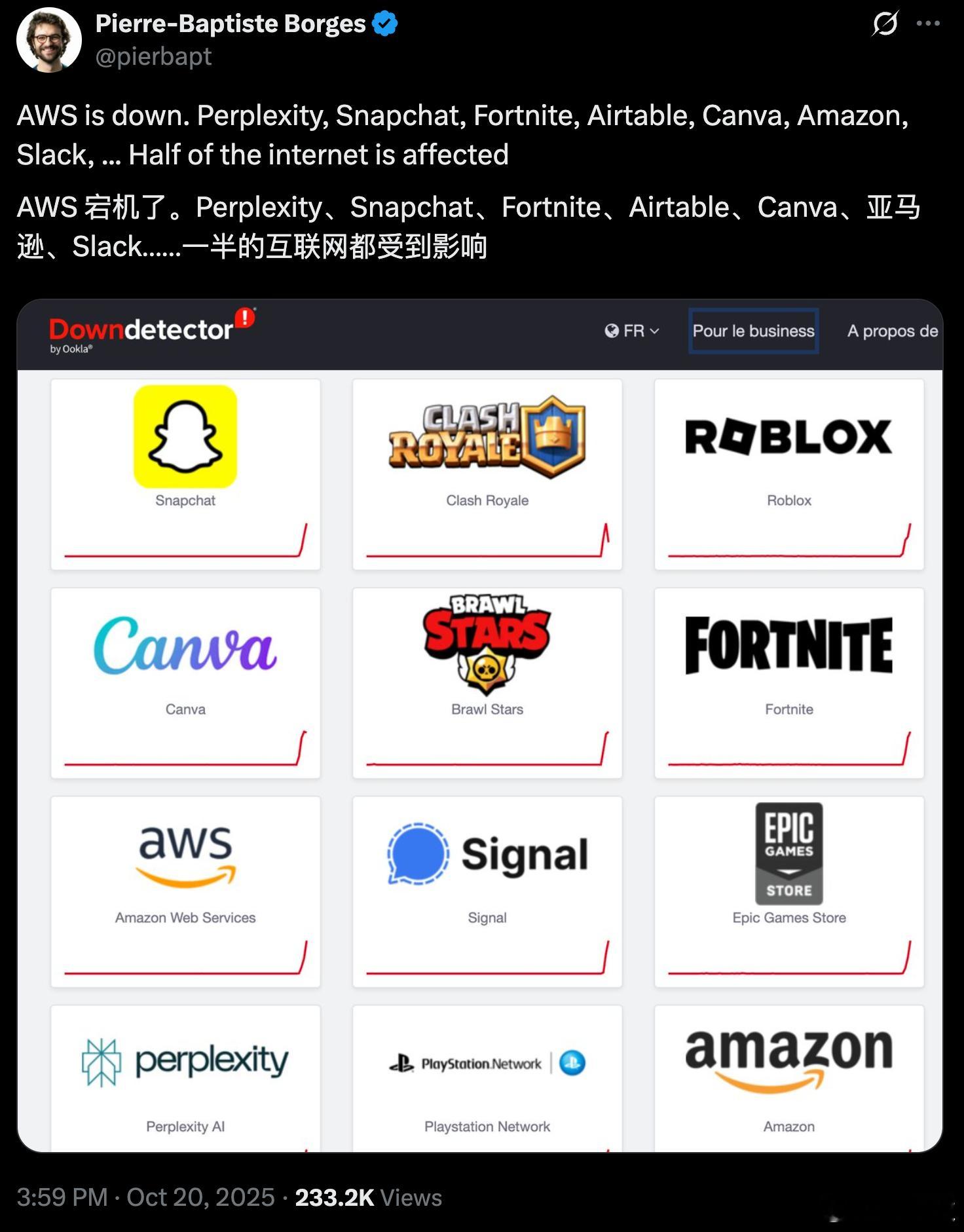 与此同时,Docker上游——AWS出事了,服务器宕机,大片互联网服务都受到影响。