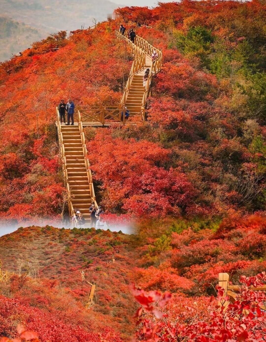 京郊这条赏枫栈道 📍导航地址:北京市房山区南窖乡水峪民俗村 🚗 自驾路线指引: 看见“枫叶桥”后右转 → 驶入小路(注意道窄!)→ 沿途每个路口持续右转 → 经过废弃景区后继续前行约1公里 → 到达栈道入口处 游玩攻略: 登顶仅需40分钟左右,对懒人超级友好~一路向上,边走边拍,回头就是层林尽染的红叶山景!天气晴好时视野无敌,仿佛走进巨幅油画中,每一帧都值得收藏。 注意提醒: · 废弃景区设施较旧,栈道部分木板松动,老人与小朋友需格外小心 · 坡度略陡但不长,建议轻装出行 · 雨天慎行!谨防山体滑坡 · 对宠物友好,可以带上毛孩子一起出镜~ 🍁 最佳观赏期:10月底 - 11月中旬 选个晴朗的日子出发吧!登顶远眺,漫山红叶与蓝天白云相映,随手一拍都是大片质感~这个秋天错过真的会遗憾! ❗️再次提醒:属于未开发景区,游玩务必安全第一! 📍水峪民俗村 🕒 开放时间:全天开放