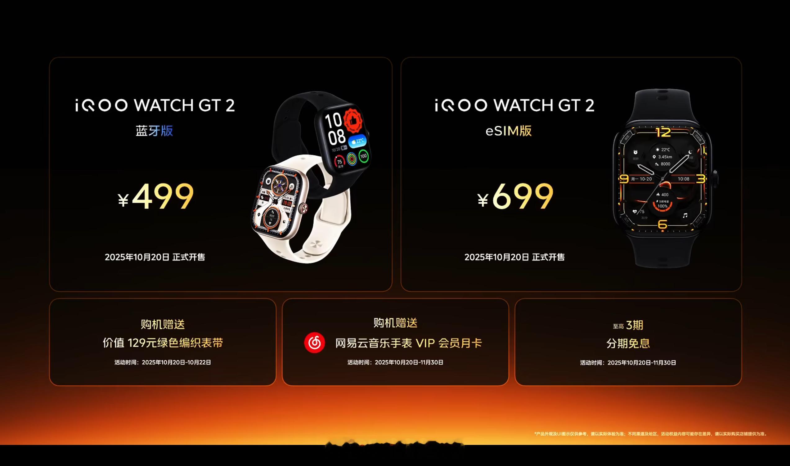 iQOO WATCH GT 2 发布,蓝牙版售价 499 元、eSIM 版售价 699 元。