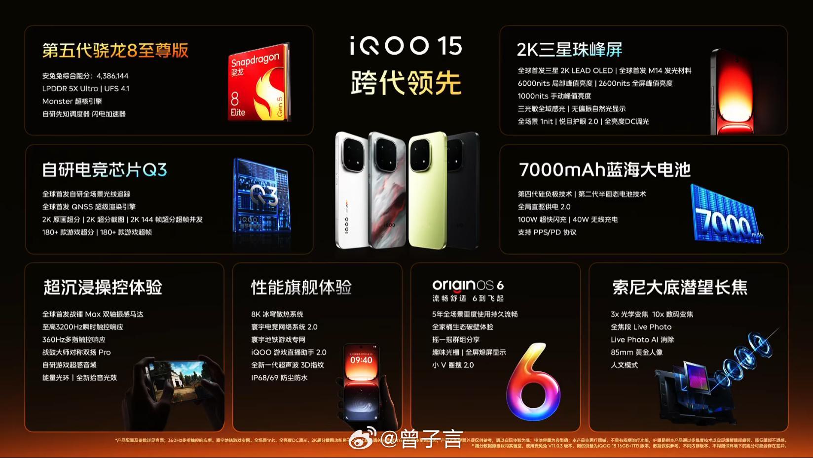 性能方面,iQOO 15 搭载了第五代骁龙8 至尊版,并与自研电竞芯片Q3 协同工作,支持全场景光追与 2K + 144 帧并发,配合 Monster 超核引擎与升级的冰穹散热系统,确保了持久稳定的巅峰性能输出。
