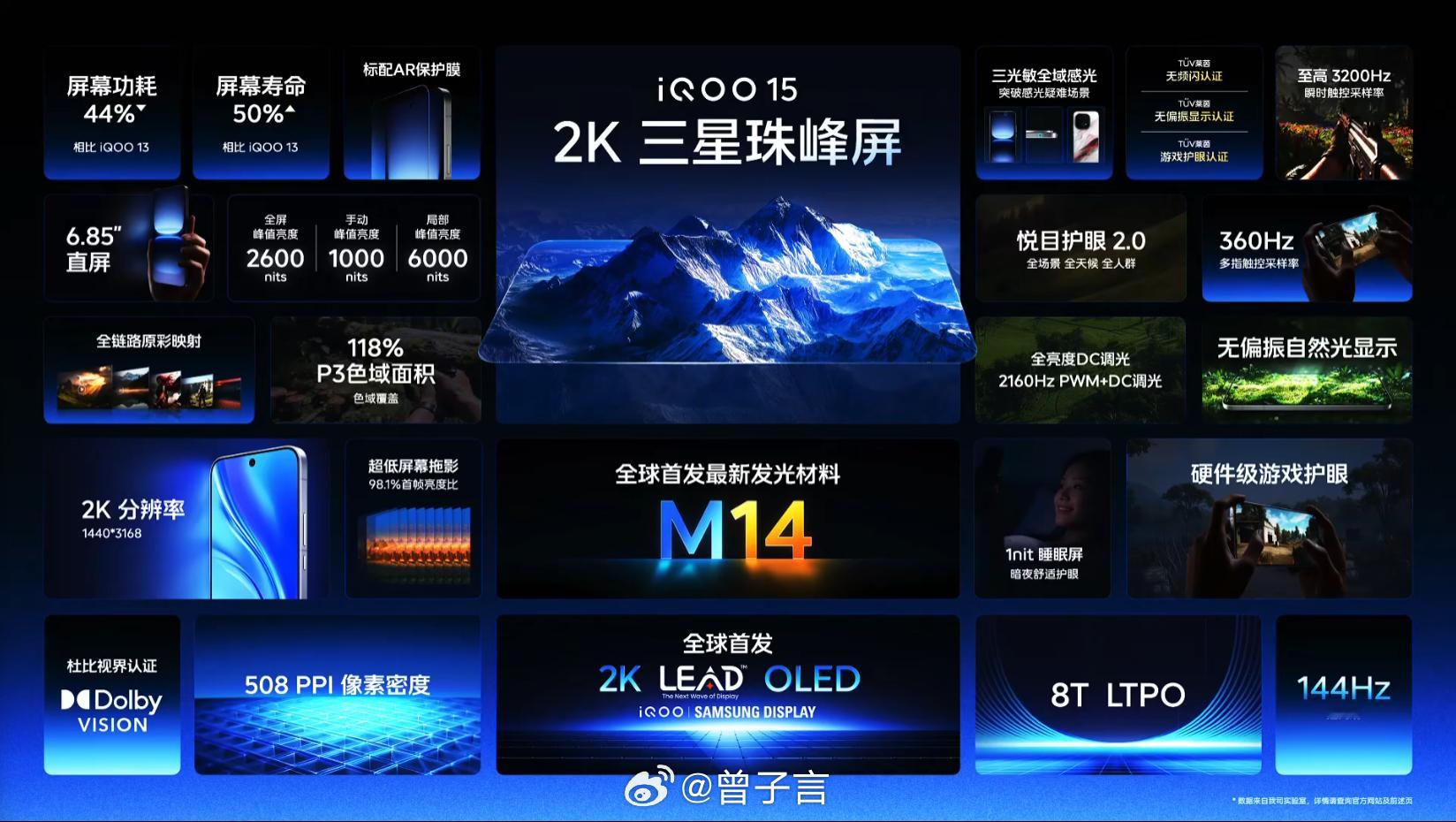 iQOO 15 搭载全球首发的 2K 三星珠峰屏,采用最新 M14 发光材料与 LEAD OLED 技术,在保证超高亮度与清晰度的同时,实现更低功耗与更优护眼效果。