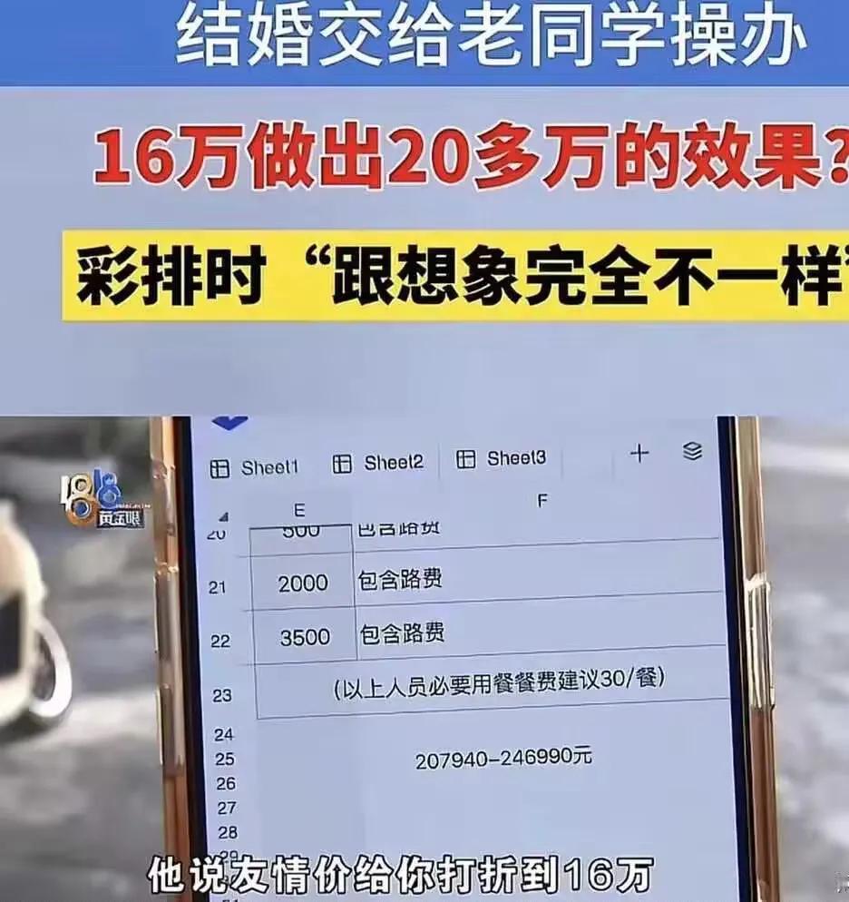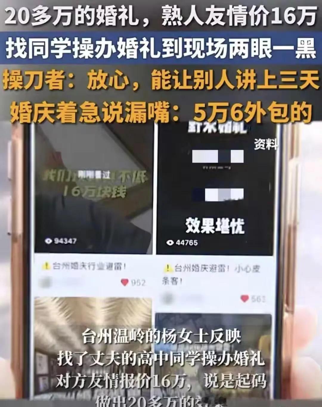 都说熟人好办事,可坑人的,大概率也是熟人。信任值多少钱?对台州的杨女士来说,答案是近10万的差价,和一场心碎的婚礼。 本想图个放心,杨女士花16万请老同学操办婚礼,对方承诺做出20多万的效果,保证效果能让村里人唠上三天。结果现场布置廉价,假花陈旧褪色,后来才知整个婚礼被同学以5.6万元打包外包,自己吃了大笔回扣。因碍于情面没签详细合同,维权变得艰难。 这事就是典型的杀熟!精准踩中了杀熟的痛点。利用熟人间的信任降低交易成本,却用纯粹的市场逻辑追求利润最大化,把人情变成了宰客的利器。类似装修,购房等领域,熟人陷阱屡见不鲜,透支着宝贵的多年情谊。 以后牵扯到金钱的事还是别找熟人,除非非他不可。这事提醒我们,无论关系多铁,涉及大额金钱交易,白纸黑字的合同,明确的权责界定远比口头承诺和所谓情分来得可靠。别让不好意思最终伤了钱财,又寒了心。亲兄弟尚且还得明算账。 婚礼的遗憾或许能通过法律途径追回部分损失,但肯定是要失去一个朋友了。万幸,失去了这个朋友!