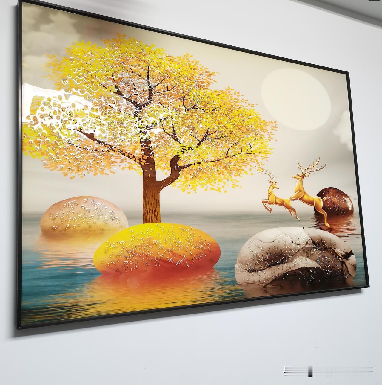 这幅装饰画如一首立体的诗 金黄的树似打翻的调色盘, 将秋意凝于枝叶间,每一片叶都闪烁着艺术的光泽。 两只金鹿跃动身姿,是灵动的使者,携着“路路亨通”的祈愿。 石的肌理或温润或苍劲,在水波倒影里晕染成诗,与圆月初升的天际相映,勾勒出静谧又富生机的画面。 它以轻奢的质感、吉祥的意象,为空间注入艺术温度, 当目光落于其上,便似踏入一场秋的绮梦, 在树的绚烂、鹿的跃动、石的沉静中,收获视觉与心灵的双重滋养。