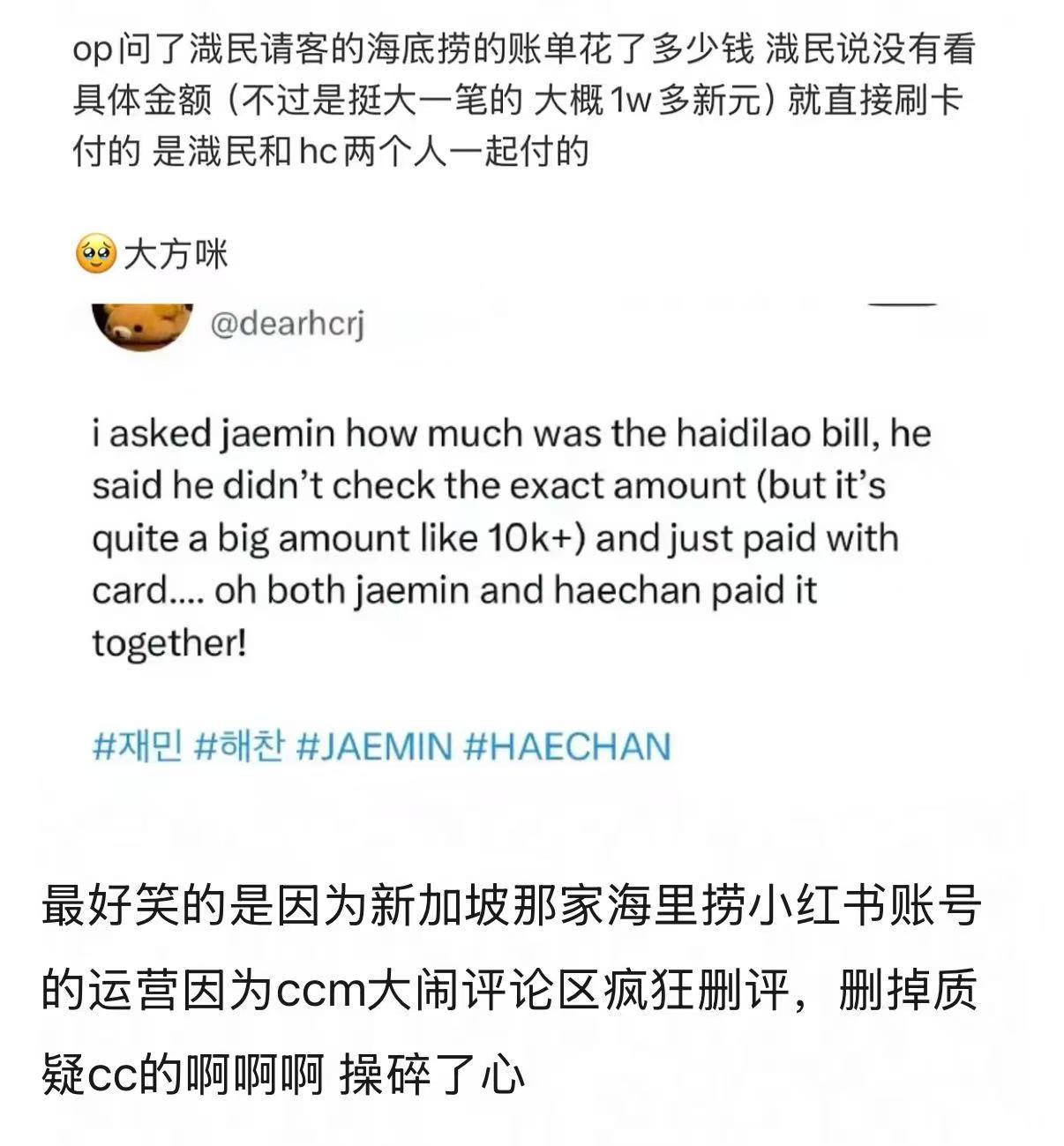 黄仁俊粉丝说的海底捞买单宠粉原来是罗渽民和李楷灿付的钱好尴尬吧…