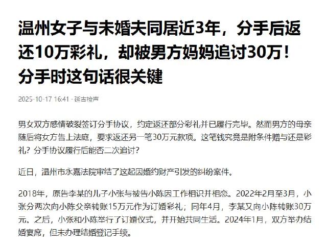 分手时签订了分手协议,履约返还10万彩礼后,却被男方妈妈追讨30万!究竟怎么回事