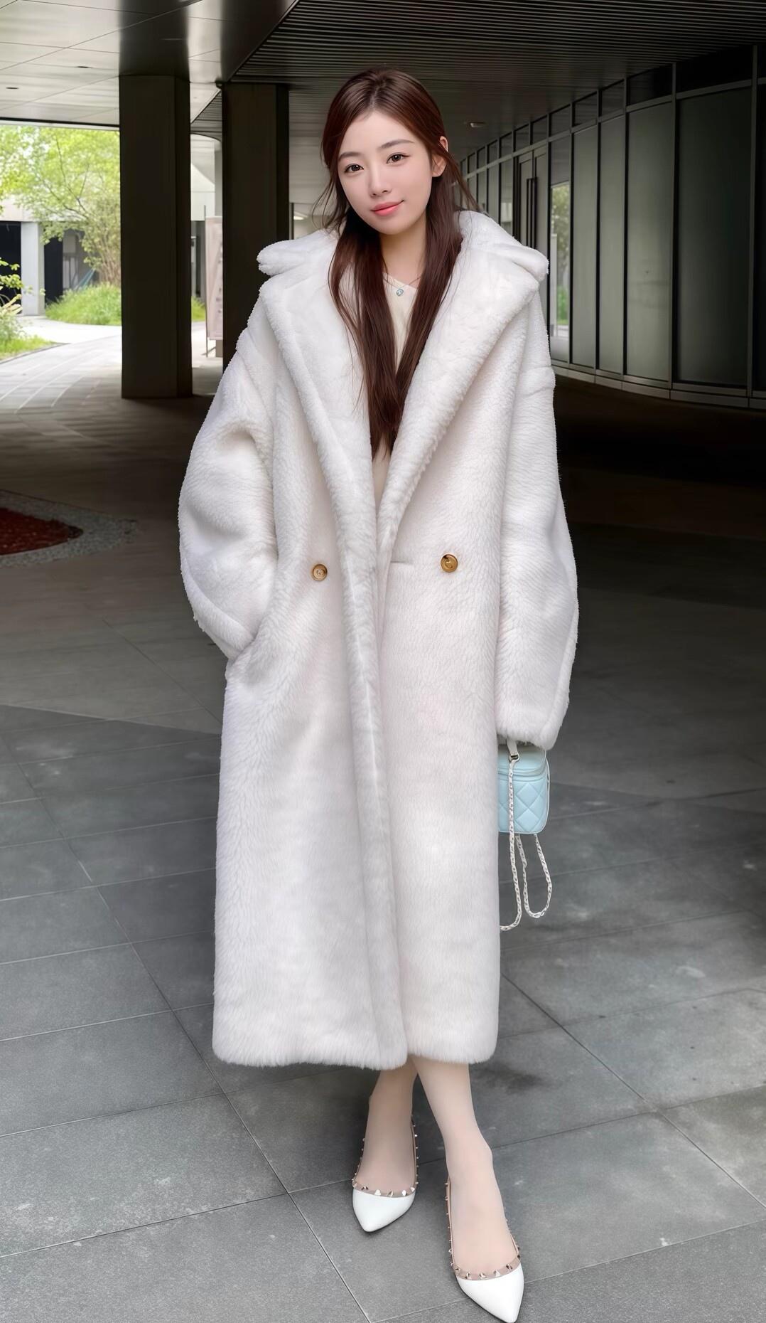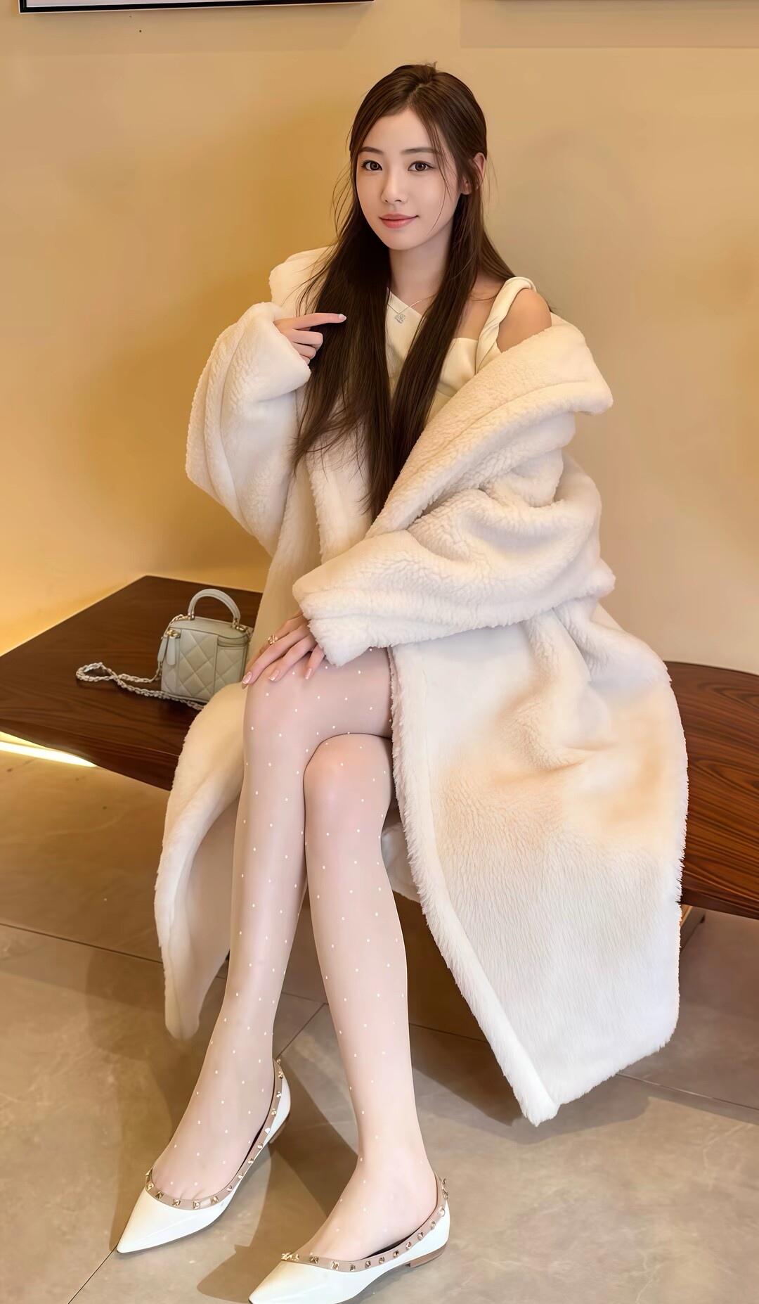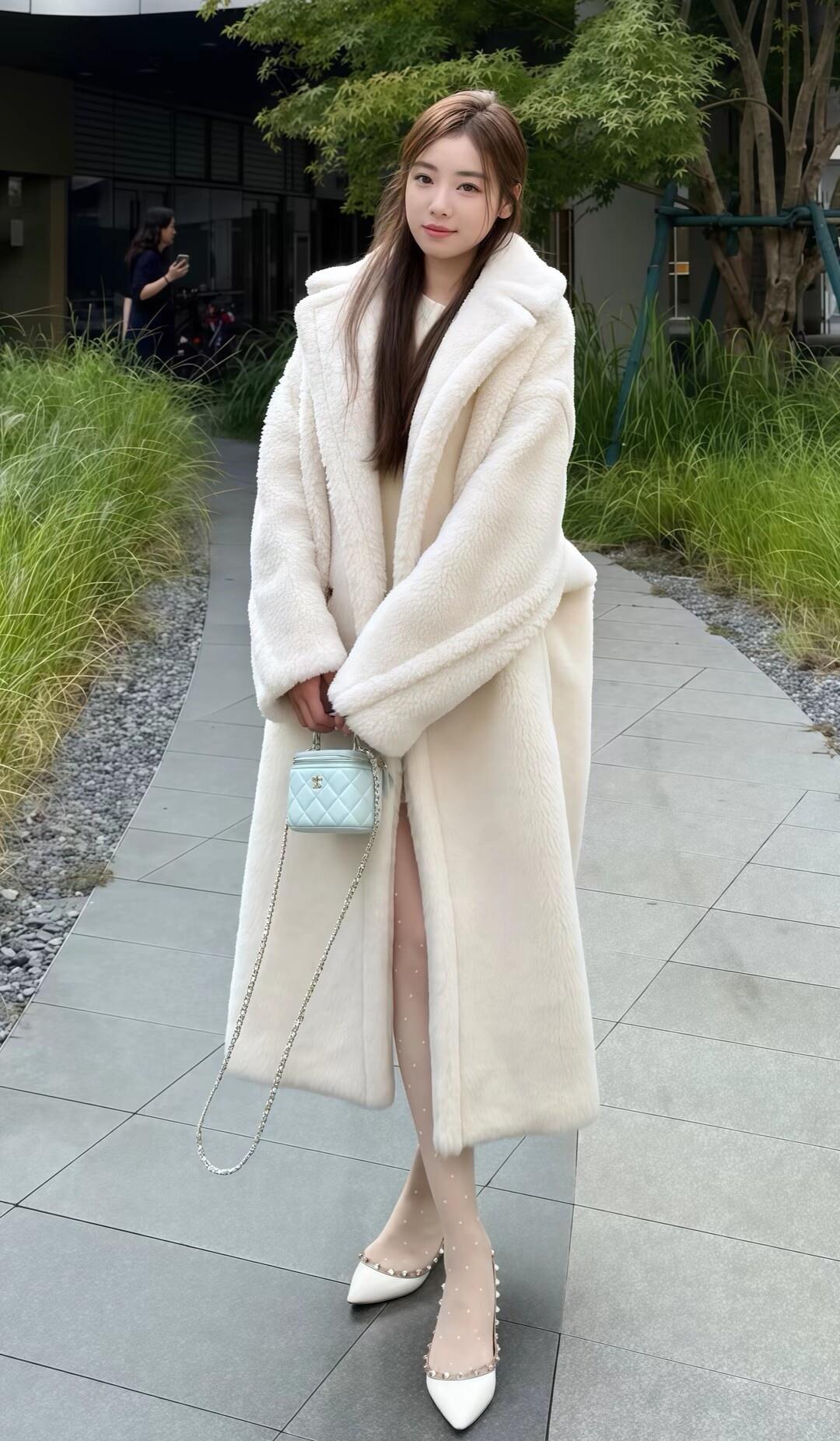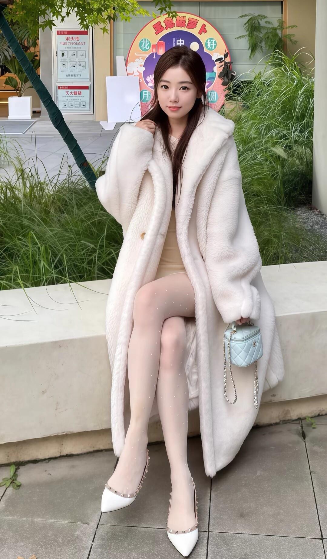 这姑娘穿着毛绒大衣,坐在长椅上。