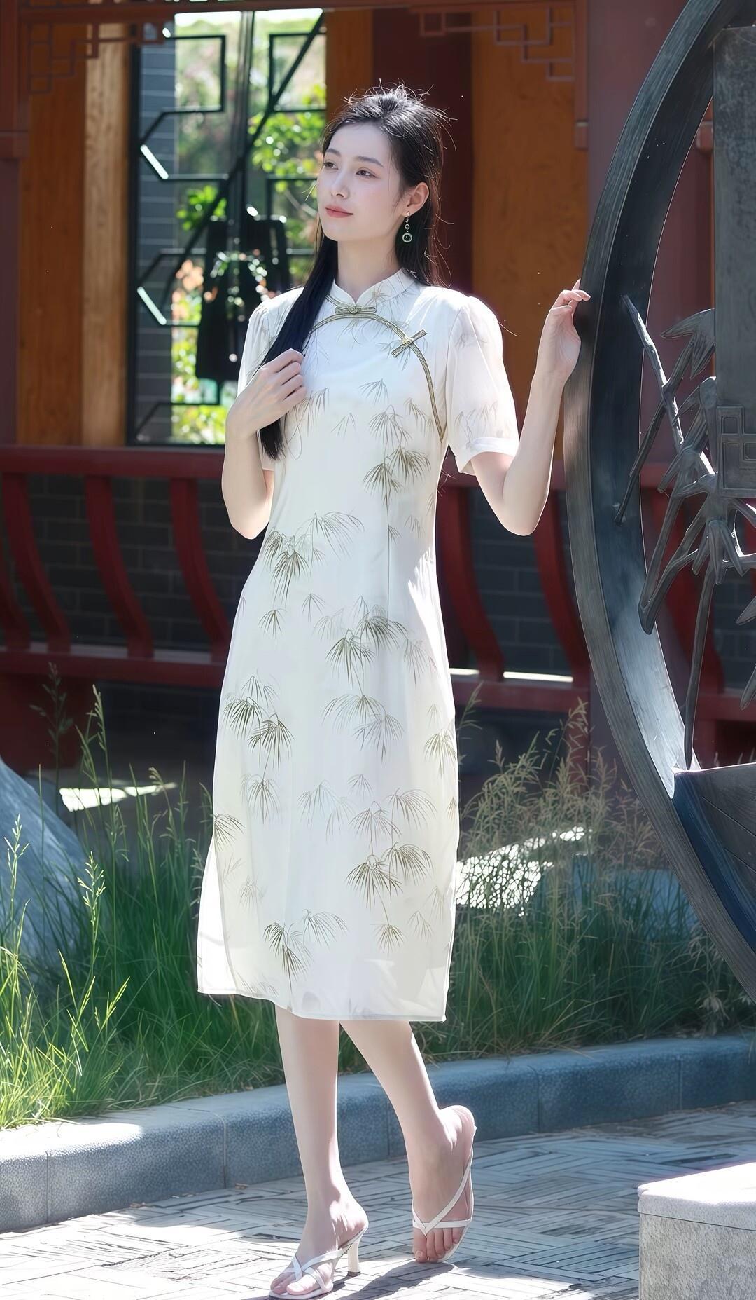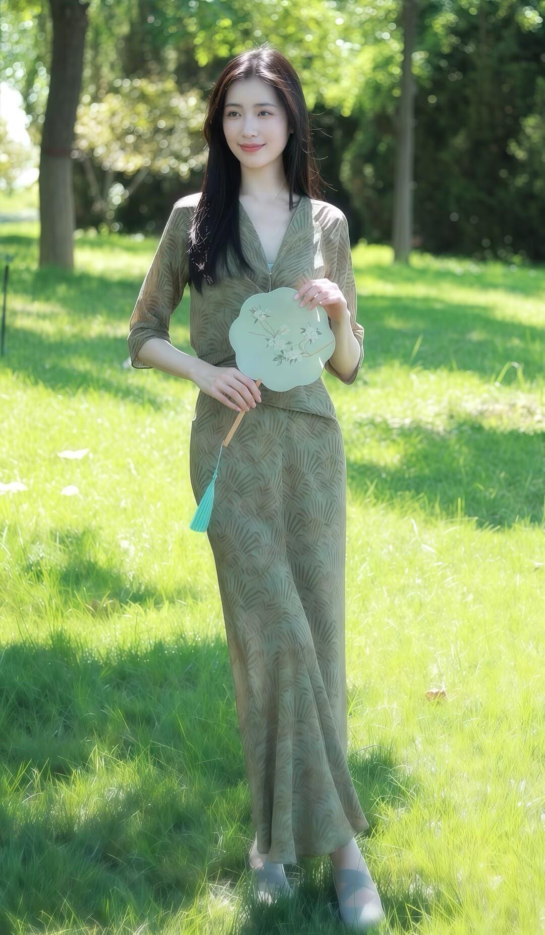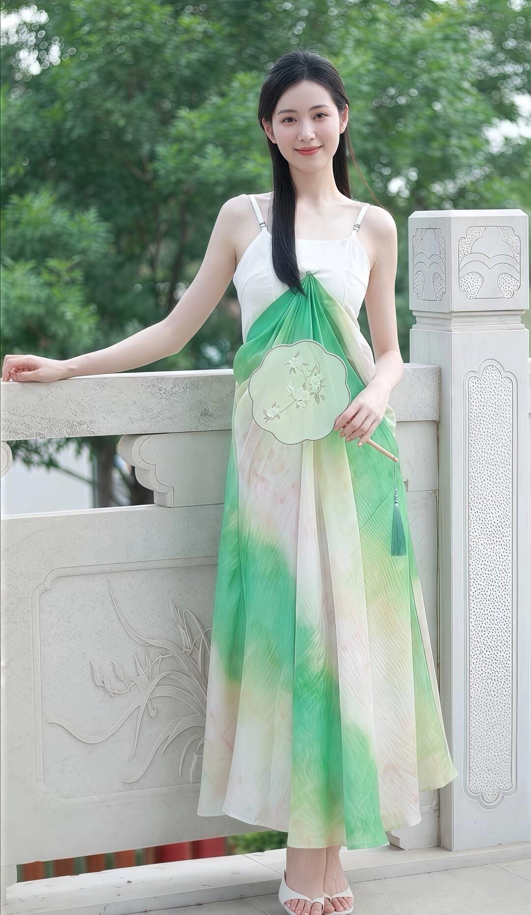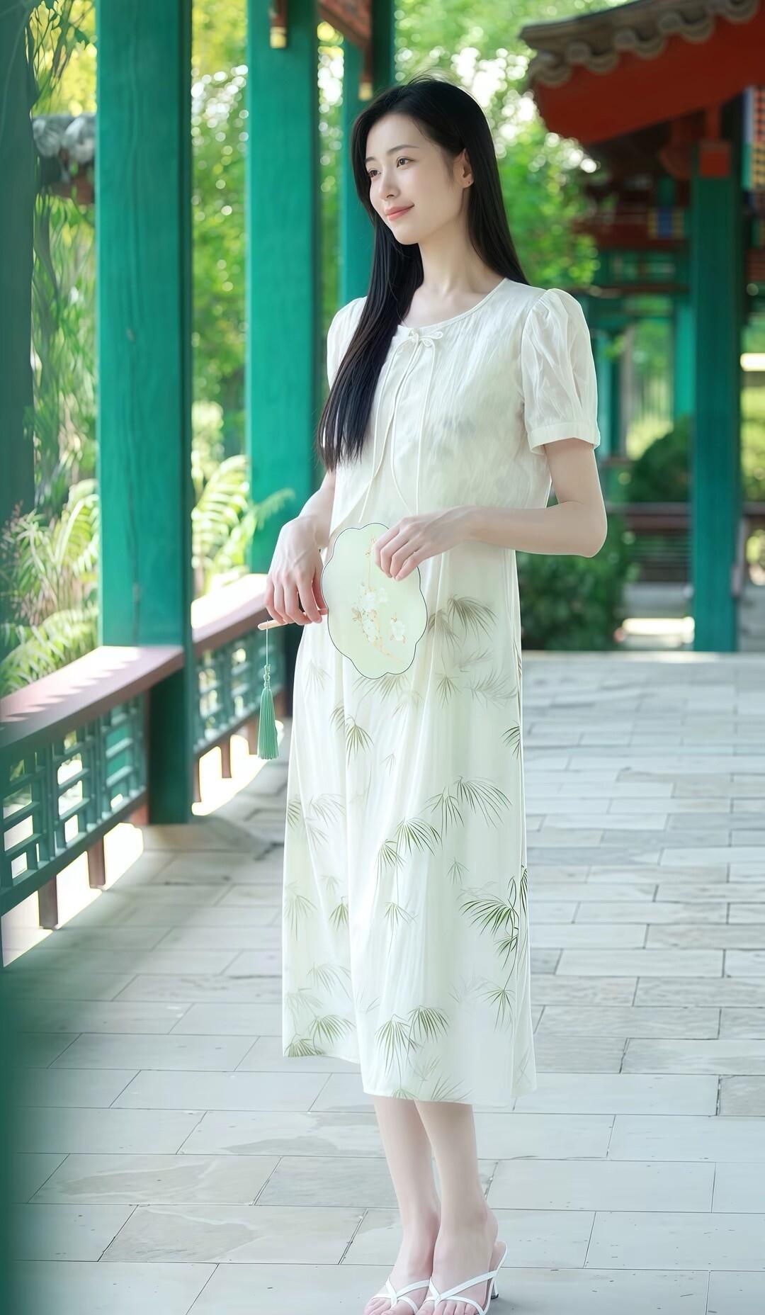 夏日清新穿搭,绿白相间连衣裙,优雅坐于长椅上,手持团扇,尽显温婉气质。