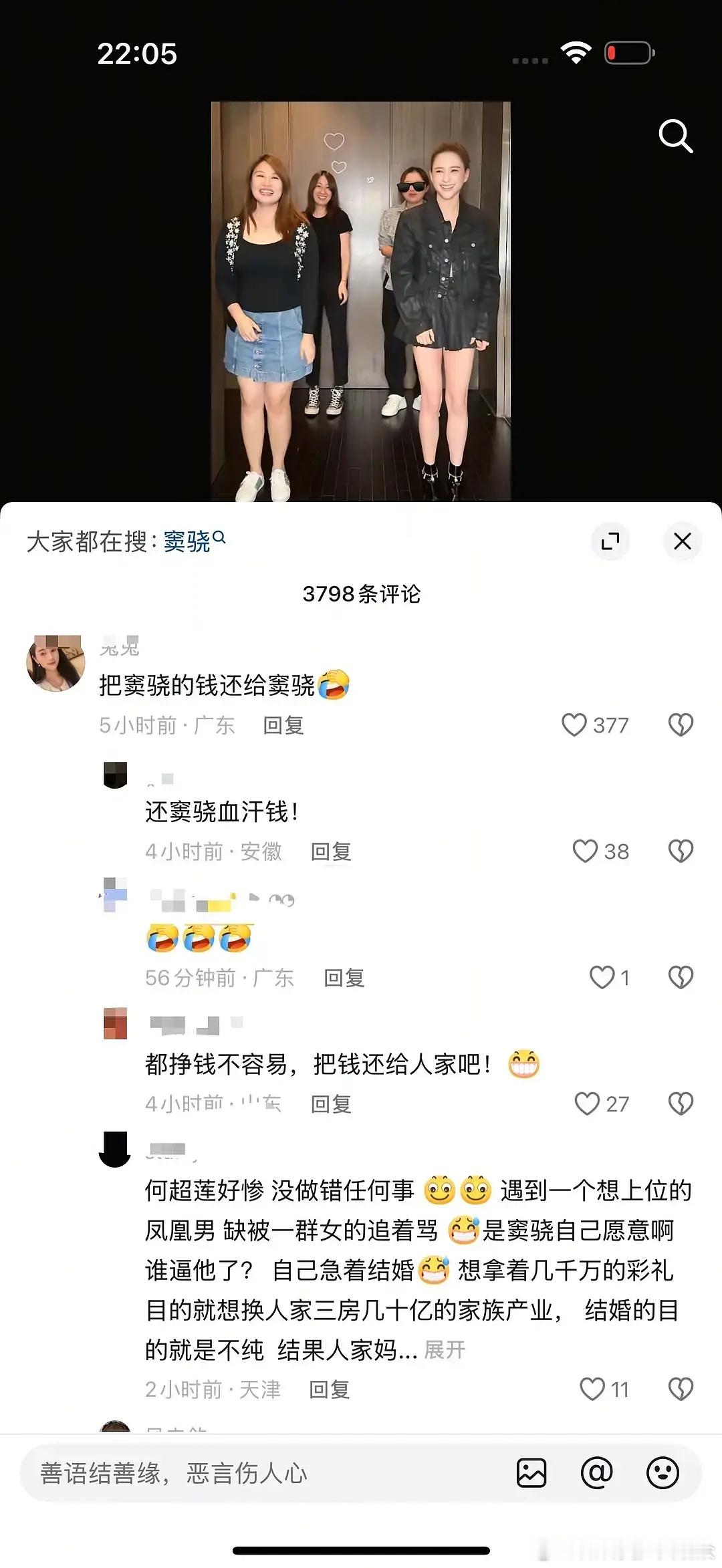 何超莲抖音被冲了...还有说把窦骁的钱还给窦骁的,其实骂的人自己也想傍富婆但是傍