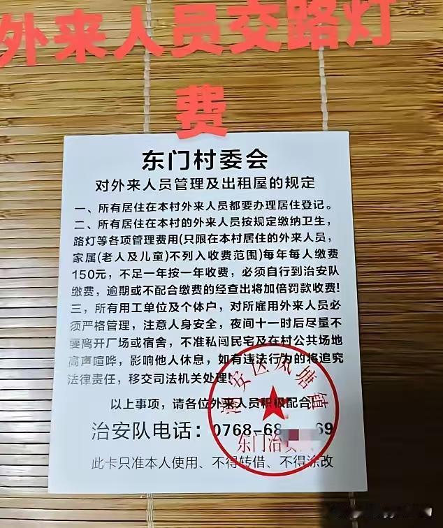 吃相太难看,干脆明抢得了! 广东潮州市潮安区凤塘镇东门村委会发布关于对外来人员和出租房管理的规定:所有居住在村里的外来人员都要办理居住登记;所有居住在村里的外来人员按规定缴纳卫生、路灯等各项管理费用,每年每人缴费150元,不足一年按一年收费,必须自行到治安队缴费,逾期或不配合缴费的经查出将加倍罚款收费。 卫生费已经在:水费,中收了??至于路灯费,现在大多数是太阳能灯,那只有路灯成本,装路灯是为了广大村民夜晚可看见路,但并不是外来人员占多数?? 深圳一户每个月20元卫生费,从来没有听过路灯费,路灯不是市政管的吗?为什么要外来人员给,不想要外地人来就直说,全部外地人赶走,只有你们本地人。 这是变相歧视行为,难道外来人员就不是中华人民共和国公民?