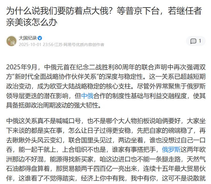 为什么说中国得防着点俄罗斯?说白了,普京今年72岁,这位掌舵俄罗斯25年的硬汉终究会迎来谢幕,那么万一接普京班的人是个亲美派,中俄现在抱团取暖的局面会不会一夜翻车? 普京今年72岁,从2000年上台到现在,俄罗斯的内政外交几乎都刻着他的印记,中俄关系能走到今天的“历史最好时期”,他的战略眼光和强硬立场是关键。 但人总有老去的一天,俄罗斯的权力交接从来都藏着不确定性,谁也没法保证下一位掌舵人会沿着他的路子走。 翻翻老黄历就知道,俄罗斯领导人的偏好对中俄关系的影响可不是闹着玩的。上世纪90年代苏联刚解体那会,叶利钦接手的俄罗斯一穷二白,一门心思要抱西方大腿,搞“一边倒”的外交政策,把中国晾在一边。 那时候中俄关系别说“战略协作”,连正常的经贸往来都少得可怜,直到后来发现西方根本没打算真心帮他,反而一个劲地挤压俄罗斯的生存空间,叶利钦才转头看向中国,这才有了1996年的战略协作伙伴关系。 现在中俄关系看着铁,核心其实是利益绑得紧,而这利益里最粗的纽带就是能源。 2024年的数据摆在那,咱们从俄罗斯进口的原油就有1.0847亿吨,占了全国进口总量的19.6%,差不多每五桶进口原油里就有一桶来自俄罗斯。天然气更不用说,管道输气量310亿立方米,液化天然气还运了860万吨,俄罗斯早就成了咱们天然气进口的头把交椅。 西伯利亚力量1号管道从2019年通气到2024年11月,已经送过来780亿立方米天然气,满负荷运行后一年能供1.3亿户家庭用气,这可是东部沿海地区的“气柱子”。 更别说还有规划中的西伯利亚力量2号,2030年后每年能再送500亿立方米过来,远东线路2027年也能贡献100亿立方米。 这些管道可不是挖沟埋管那么简单,背后都是真金白银的投入。 中国企业参与亚马尔LNG项目建设,国产化率从15%硬生生提到45%,带动了50多亿美元的设备出口,这都是一点点砸出来的家底。贸易结算上也越来越绑定,2023年中俄油气贸易里40%都用本币结账,人民币和卢布的直接兑换量一年涨了300%。 这种绑定在普京时代是双赢,俄罗斯靠咱们打开亚洲市场,避开西方制裁,咱们靠俄罗斯稳定能源供应,可要是换个亲美派上台,这账就得重新算。 亲美派要讨好西方,最简单的办法就是拿对华合作开刀。西方一直想掐断俄罗斯的能源出口渠道,要是新总统主动把对华能源供应缩减,甚至给管道运输找麻烦,咱们的能源安全就得打个大问号。 毕竟现在四大能源战略通道里,东北这条线严重依赖俄罗斯,真出问题了,短期内找替代来源可不是那么容易。而且那些正在推进的北极LNG—3项目、氢能合作,还有欧亚能源互联网的规划,说不定直接就黄了,之前的投入都得打水漂。 有人可能觉得俄罗斯不会这么傻,放着中国这个大客户不做。但别忘了,国家关系从来都是“跟着老大走”,要是新总统一门心思想融入西方,甚至想让西方解除制裁,牺牲点对华利益太正常了。 俄罗斯国内本来就有不少亲西方的精英阶层,觉得跟着欧美才有“前途”,之前是普京压着,等他下台,这些人说不定就冒头了。到时候别说能源合作,连那些本币结算、技术合作的成果,都可能被慢慢拆解。 更有意思的是,中俄关系现在的“热乎劲”,很大程度上是靠普京的个人权威撑着。 他从2000年上台就定了对华合作的调子,2000年签的《北京宣言》直接把两国关系拉上战略轨道,之后20多年一路加码。 可俄罗斯的权力交接从来没什么固定章法,叶利钦当年突然辞职,把权力扔给刚当总理4个月的普京,全世界都傻了眼。下一次谁上台,是军方背景的强硬派,还是亲西方的technocrat(技术官僚),根本没人能打包票。 中国也不是没做准备,这几年一直在搞能源进口多元化,从沙特、伊拉克进口的原油也不少,四大能源通道里还有西北的中亚线、西南的中缅线和海上通道。但架不住俄罗斯的供应又稳又近,价格还相对划算,短期内根本没法完全替代。 说到底,国家之间哪有什么“铁哥们”,本质都是“利益合伙人”。普京在的时候,中俄有共同的对手,有互补的需求,自然能抱团取暖。 可他一旦谢幕,新掌舵人要是觉得跟美国合作更划算,之前的一切默契都可能烟消云散。那些建了一半的管道、签了多年的合同,在政治转向面前可能连废纸都不如。 中国防着点,不是不信俄罗斯,而是不信“人走茶凉”的政治规律,不信把国家利益绑在某个人身上的赌局。 真正的安全从来不是靠别人给的,而是自己攒出来的。能源进口多找几个卖家,技术合作多铺几条路子,国际舞台上多攒点人脉,就算中俄关系真有起伏,咱们也能扛得住。 毕竟普京终会老去,但中国的发展不会停,把希望寄托在别人身上,不如把自己的底盘扎得更稳,这才是最实在的道理。 参考资料:《新华社》《中国网》