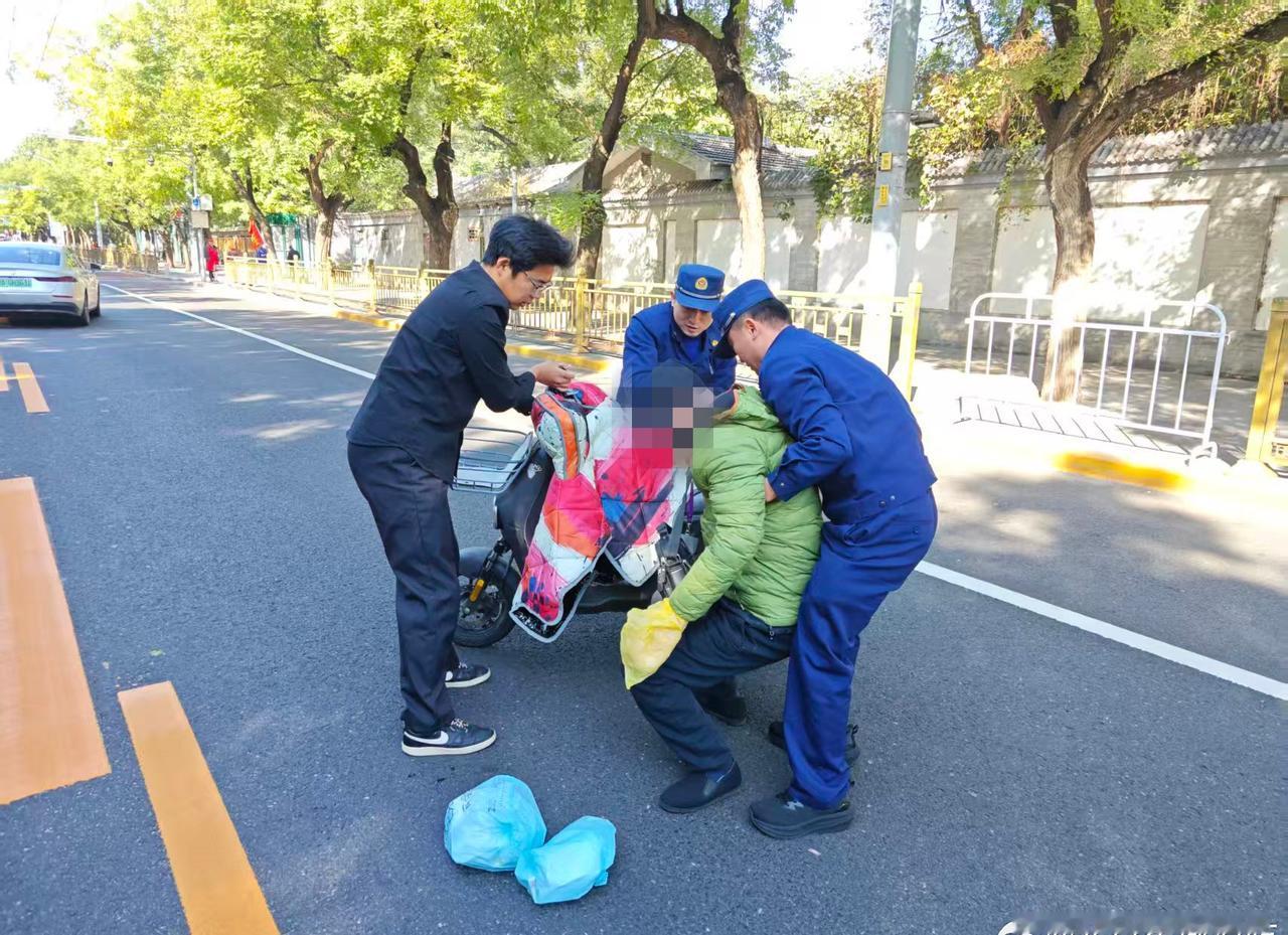 “暖心救助!”七旬老人骑车摔倒马路中央 消防员车流中飞奔救援 10月20日,上午10时16分,景山小型消防站正值在三眼井胡同西口执勤工作中,突然在距离100米处一位年近七旬的老人骑着电动车,因操作不慎突然摔倒在马路中央。周围车流密集,场面紧张,老人多次尝试起身却无法成功,情况显得危险又无助。 这时,景山小型消防站执勤车组,见状立即迅速跳下车,分工明确地行动起来:有人负责疏导交通,示意来往车辆减速绕行;另一名消防员上前轻轻扶起老人,检查他的身体状况,并安抚他的情绪。并为老人仔细查看伤情。有一位路过的男士也主动加入了帮忙的“队伍”。 经询问,原来老人因左手烫伤独自出行去医院换药,导致意外。消防员们并未就此离开,而是耐心等待老人现场情况好转,并协助系了其家人。在确认老人无大碍后,又详细嘱咐了他一些日常出行的注意事项。 整个救助过程持续了近二十分钟,消防员的及时行动不仅化解了一场潜在的危险,更让这位老人感受到了社会的温暖与关怀。最终,老人安全离开,这场马路上的小插曲在消防员的专业与善意中圆满结束。