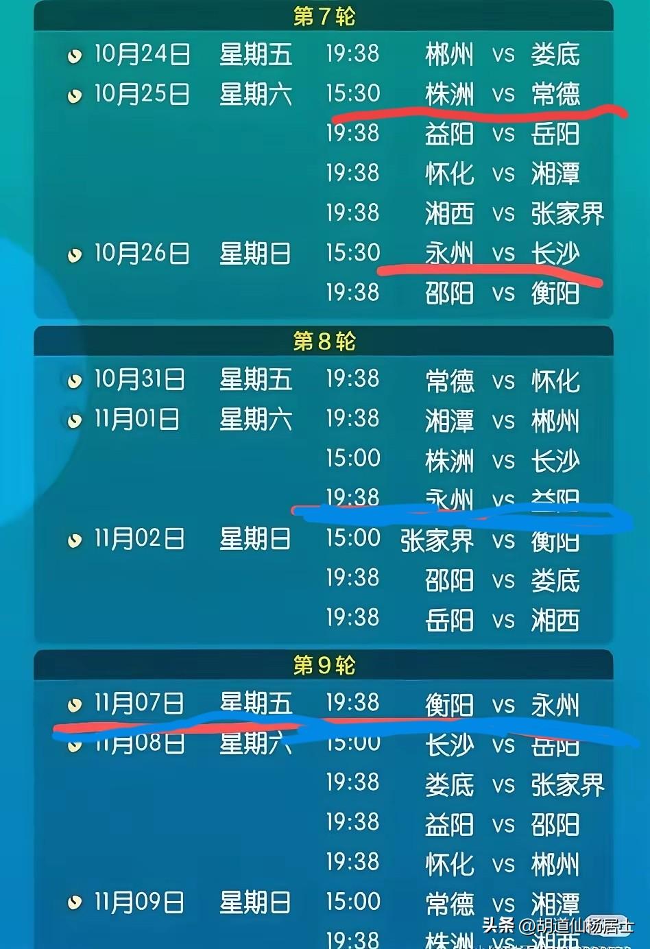 湘超最精彩、最有看点,堪比决赛的前四对前四之赛,即将在湘超第七轮比赛中打响! 湘超第七轮比赛将在10月24日到26日进行,其中25日是排名第三的株洲,在主场迎战排名第二名的常德;26日是排名第四的永州,在主场迎战排名第一的长沙。 球迷们认为,这两场比赛是湘超比赛六轮以来,最为精彩,最有看点,更是检验湘超六轮比赛后排名前四的队伍,谁是真强谁是伪强的验身之战决赛之战! 目前长沙队5胜1平积16分排第一,常德队4胜2平积14分排第二,株洲队4胜2平积14分排第三,永州队3胜3平积12分排第四;四支队伍累计进球分别是12、16、13、12个,失球分别是0、7、4、5个,净胜球分别是12、9、9、7个。目前四支队伍都没有负过,长沙队甚至还没有失球过,同时他们在进球、净胜球和积分上的差距,也不是很大。 不少球迷认为,永州队是一支弱队,前六轮比赛都是和排名后六名的队伍比的赛,这次迎战长沙队,会被长沙队按在地上摩擦,同张家界在主场和长沙比赛一样,会以0:5大惨败!但也有球迷认为,永州队体力好运气又好,和谁比赛,谁的名次就会排后,在主场迎战长沙,说不定出现大战湘潭队的结果,首破长沙队的球门,或至少也会战平拿1个积分! 株洲迎战常德,会是鹿在谁手的结果? 各位球迷们,你们不妨根据各自掌握的情报、运气等等,预测预测一下,株洲和常德、永州和长沙的两场比赛结果,以及有可能会赢几个球,输几个球,是握手言和,还是大胜大败? 等到比赛结束后,再对照一下预测,看看自己的预测准确性有多高多可怕!