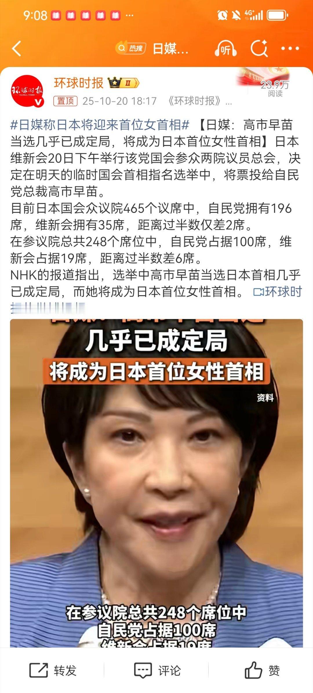 日媒称,高市早苗将零付出获得维新会支持。因为维新会不寻求分得内阁官职,主要有建