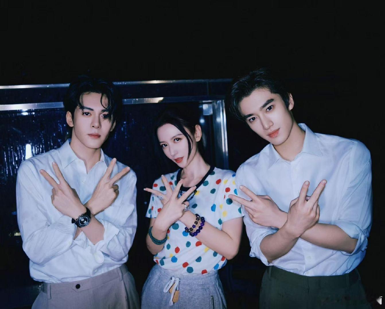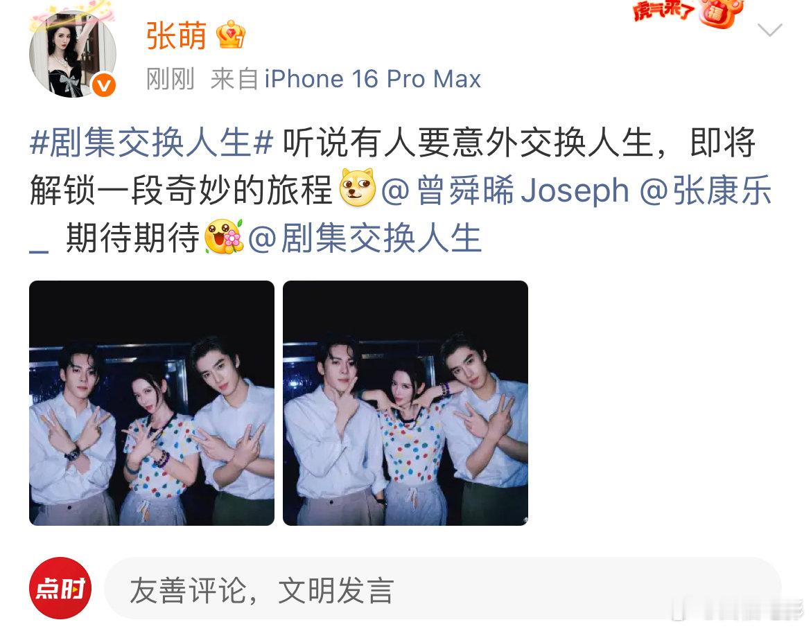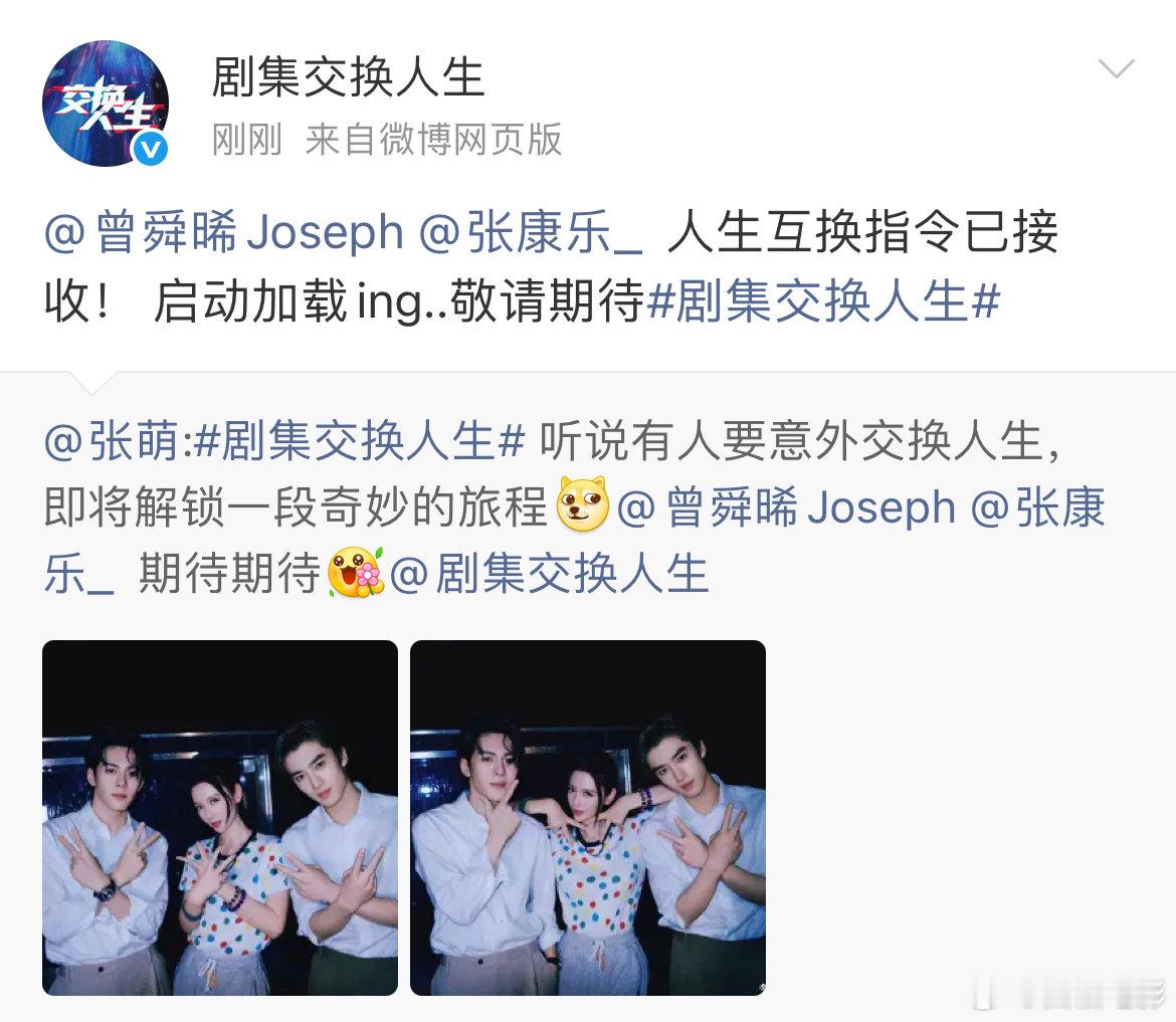 张萌晒与曾舜晞张康乐比耶合照张萌发合照官宣曾舜晞张康乐 张萌发合照官宣曾舜晞张康乐! 张萌晒与曾舜晞、张康乐比耶合照!并配文:“听说有人要意外交换人生,即将解锁一段奇妙的旅程[doge]期待期待[送花花]”