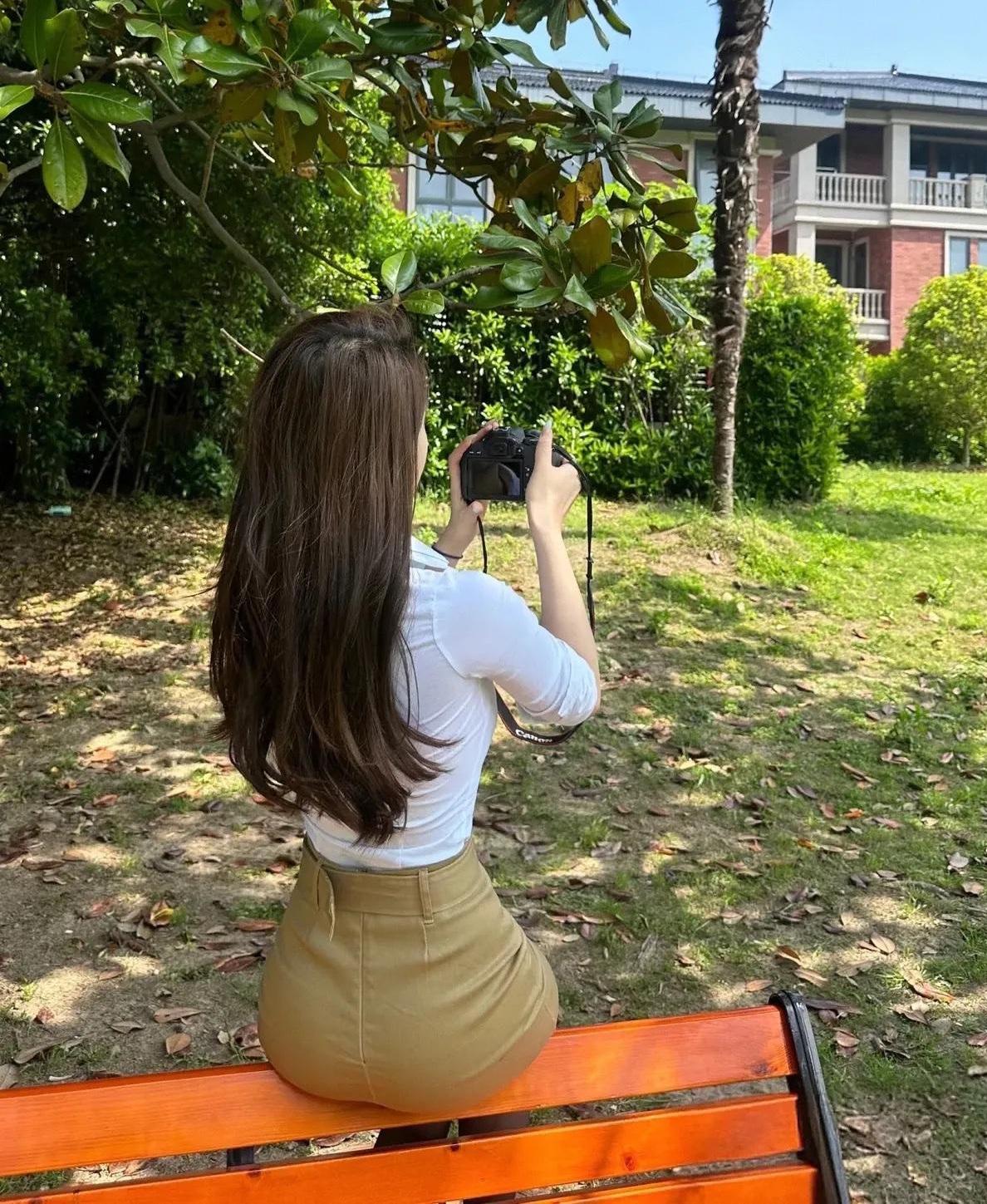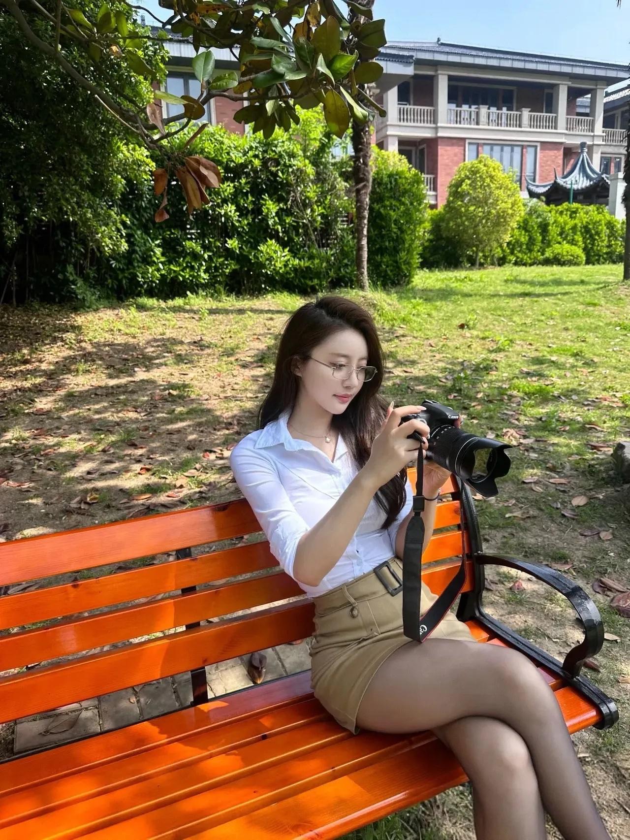 《镜头与春的私语》 当她举起相机, 春日便成了取景框里的诗行。 白衬衫熨帖着阳光的温度, 卡其色短裙漾起风的褶皱, 每一次按下快门,都是与春的私语—— 树影在镜头里打了个旋,将她的身影揉进斑驳的光斑; 长椅承托着她的姿态,像承托着一段关于美的遐想; 相机的黑与裙摆的棕,在绿意葱茏间织就鲜活的画章。 她是记录者,把鸟鸣、叶颤、风的足迹, 都收进镜头的深巷; 她亦是风景本身,在晴日的游园里,活成了一首流动的散文诗。