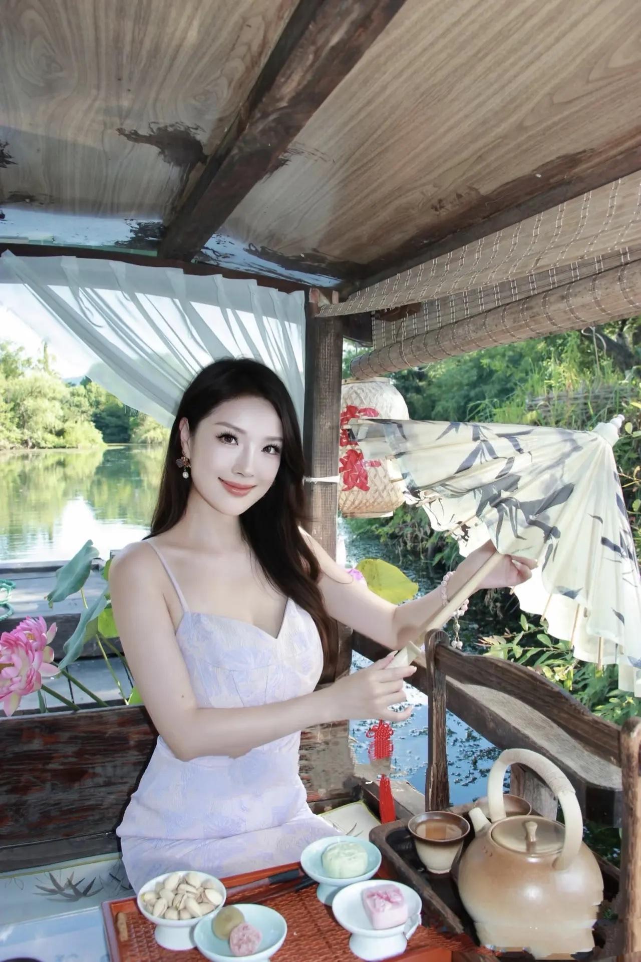 《湖上幽情》 兰舟慢泛碧荷丛,粉靥含娇映日红。 竹伞轻摇风弄影,茶烟细袅韵盈胸。 绡衣浅淡融清景,笑靥温柔入画中。 最是江南诗意处,一湖山水一帘梦。 《画船荷韵》 画船轻漾水云间,荷气清芬透薄纨。 一握莲华凝露重,半窗竹影落杯闲。 绡帘漫卷风含韵,玉腕微抬香带烟。 恰似江南春梦里,佳人笑靥胜花妍。