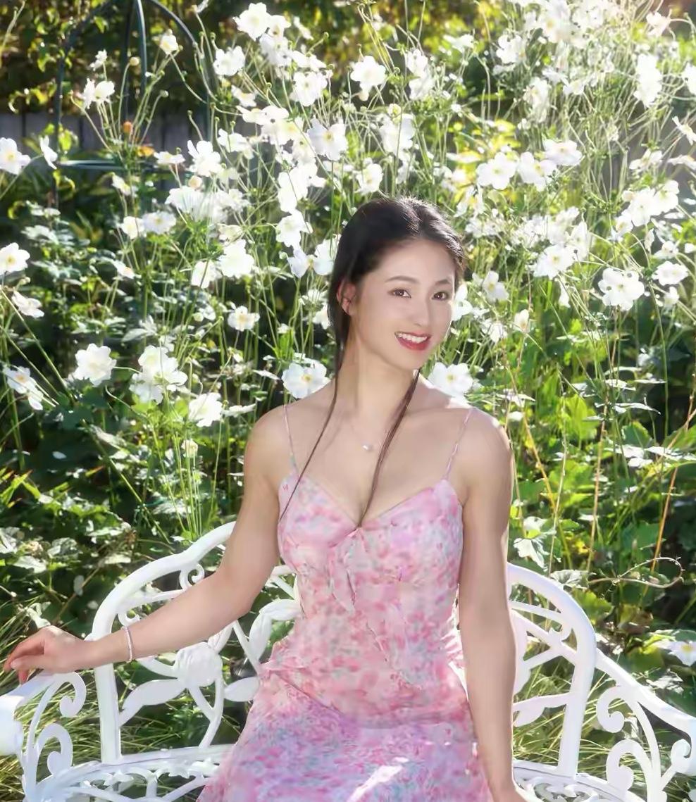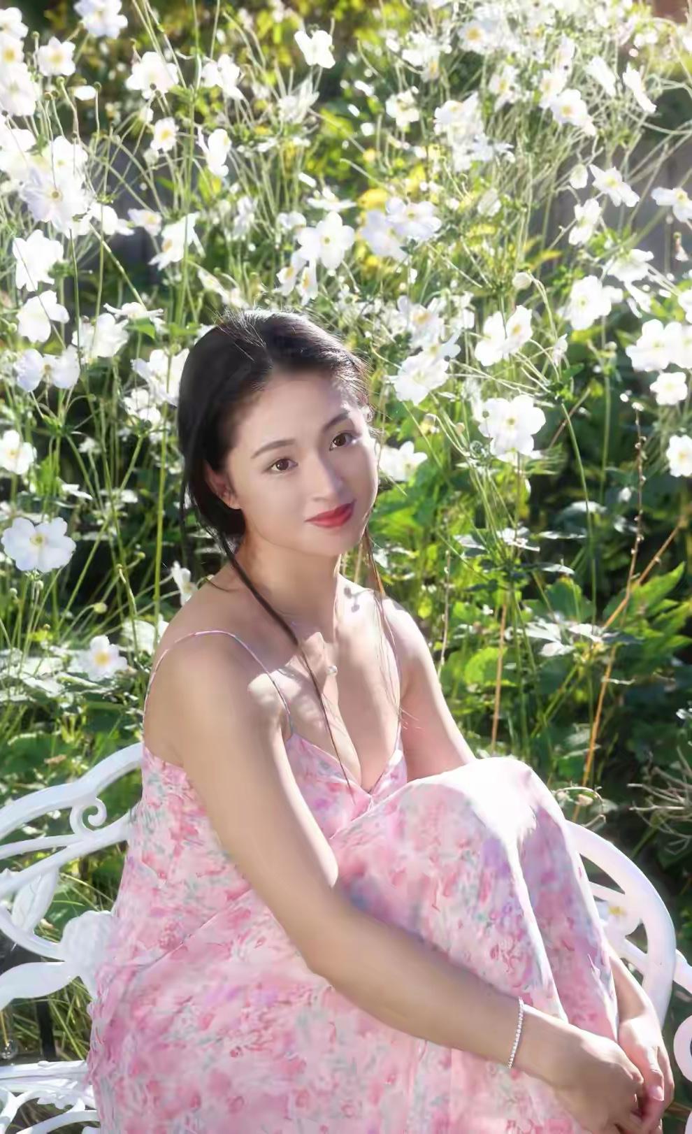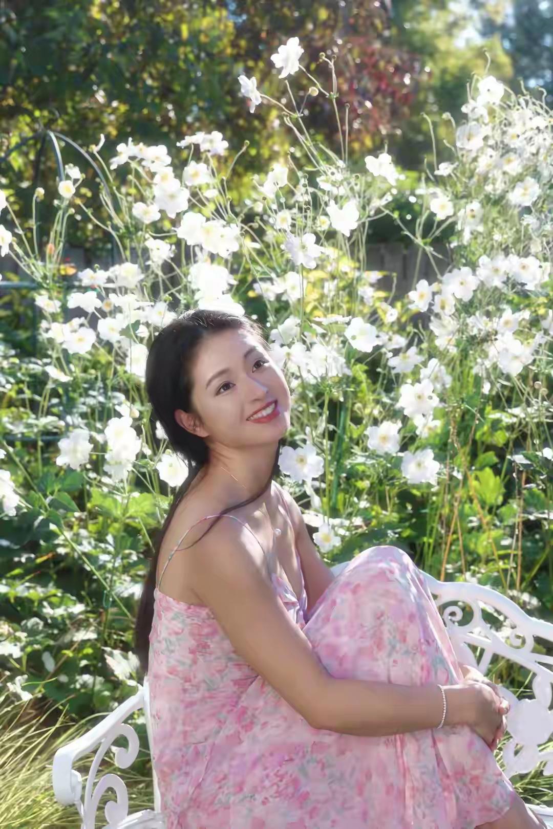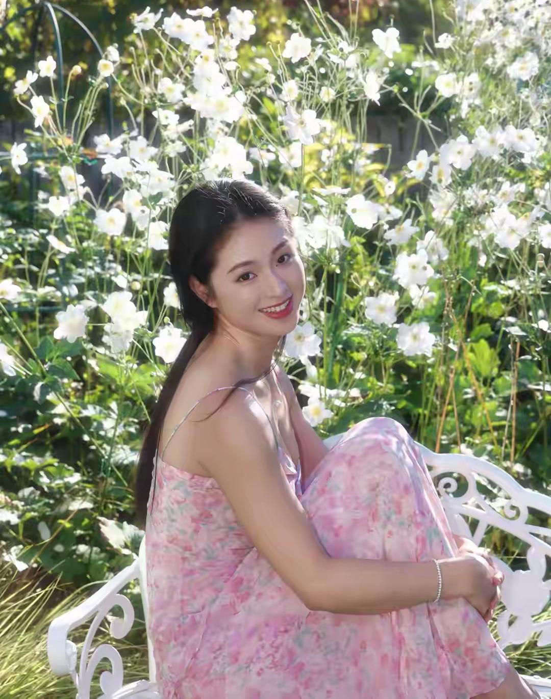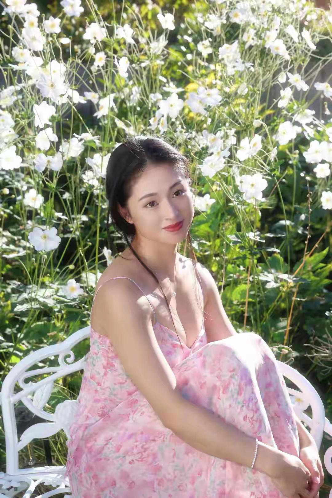 《蝶恋花·花畔佳人》 满苑琼英堆雪素。粉裙佳人,坐对香风沐。 浅笑盈盈眸若玉,吊带轻垂添清淑。 铁艺椅边春景簇。花影随身,恰把温柔筑。 一段晴光谁与共,嫣然如画情难足。 《虞美人·花甸晴光》 白花似雪铺园甸,风动香成霰。 粉裙斜坐小亭西,笑靥映花花也为痴迷。 柔丝漫绾添娇韵,腕上银环嫩。 晴光正好意迟迟,一段清欢谁解此中痴。