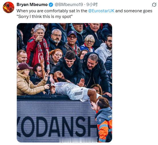 【死敌的对待】在英超双红会闪电破门的曼联前锋姆贝乌莫,在个人主页发文贴图:“当你很舒服地坐着欧洲之星列车时,有人突然跟你说,对不起,我想这是我的位置。”