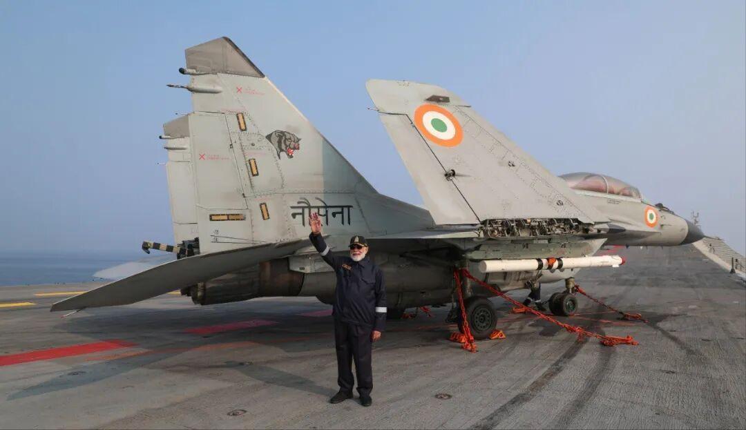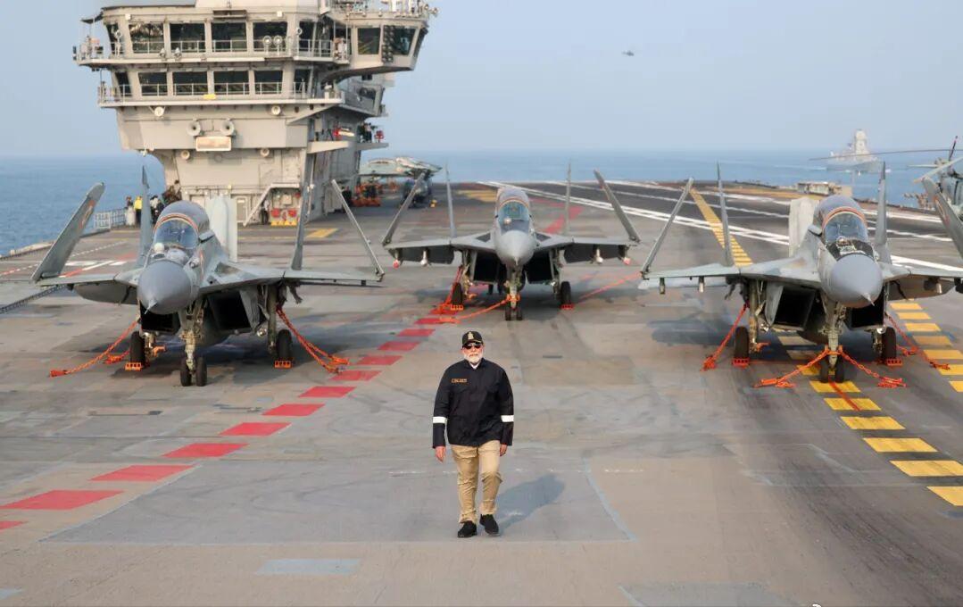 动图出来了,看来印度舰载机起降,是真的了。 不过,还是有一个疑问。 注意,印度的米格-29,在白天起飞的时候,莫迪站在指挥塔上观看,但是他的头并没有随着舰载机的起飞而扭动,而是一味地向飞行甲板上的工作人员挥手,这个举动很特别。 按理说,观察舰载机起降,眼睛肯定是盯着飞机看,不可能不转头。 仔细看,米格-29夜晚起降的画面,莫迪的头就是随着飞机扭动的。 另外一点,印度航母价甲板上,怎么感觉好多补丁呢?