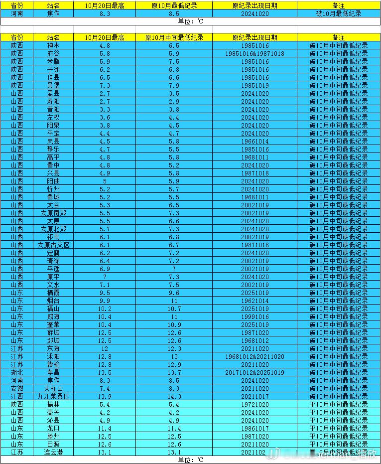 【冷到破纪录】近期因为冷空气影响,有不少气温打破同期最低纪录的情况。10月19日