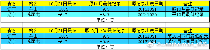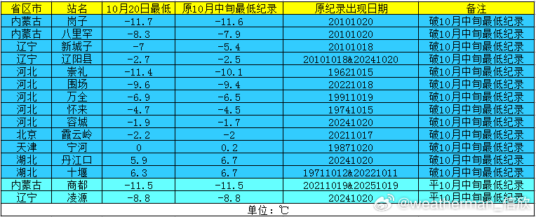 10月20日有13站最低气温打破10月中旬的最低纪录,比如河北崇礼零下11.4℃,内蒙古岗子零下11.7℃、湖北十堰6.3℃。10月21日辽宁羊山零下10.3℃,打破10月最低气温的最低纪录,苏家屯零下6.7℃追平10月最低气温纪录,打破10月下旬最低气温纪录。