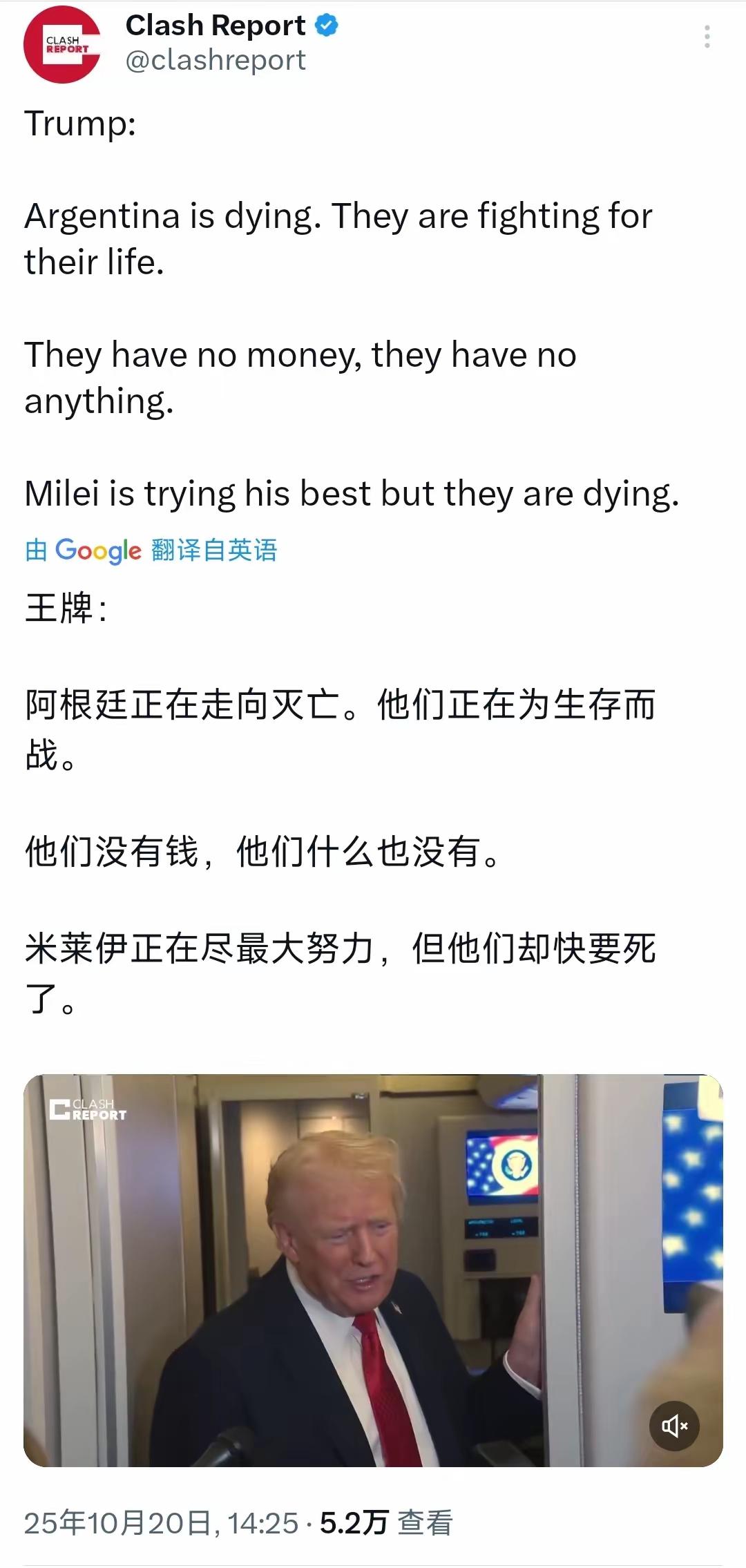 特朗普恶咒阿根廷。10月20日在空军一号接受媒体采访时表示:“阿根廷正在走向灭亡