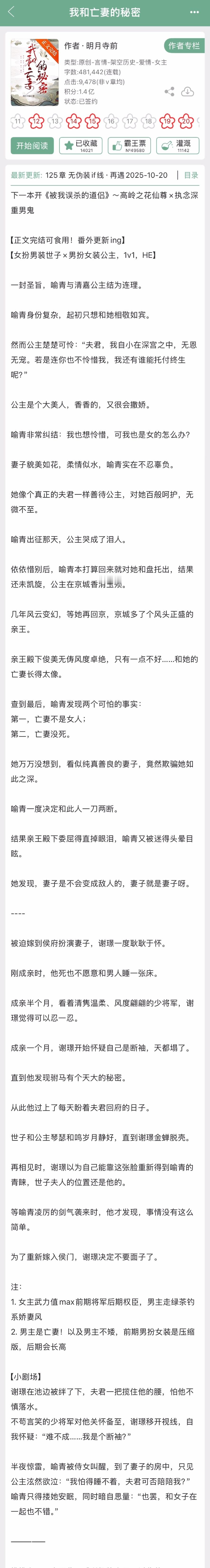 明月寺前的《我和亡妻的秘密》完结啦!古言,女扮男装世子x男扮女装公主,女主武力值max前期将军后期权臣,男主走绿茶钓系娇妻风[打call]