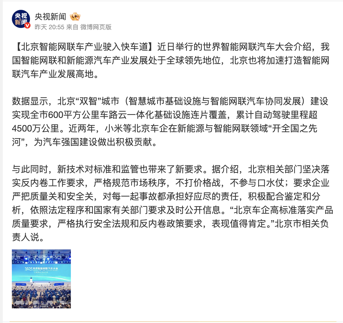 央视新闻报道,近期举行的世界智能网联汽车大会的数据显示,北京已成功完成了600平方公里的车路云一体化基础设施建设,累计自动驾驶里程超4500万公里。这个成果离不开以小米汽车为代表的北京车企的共同努力。