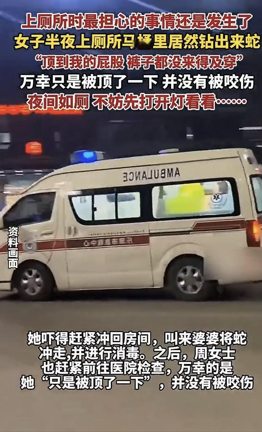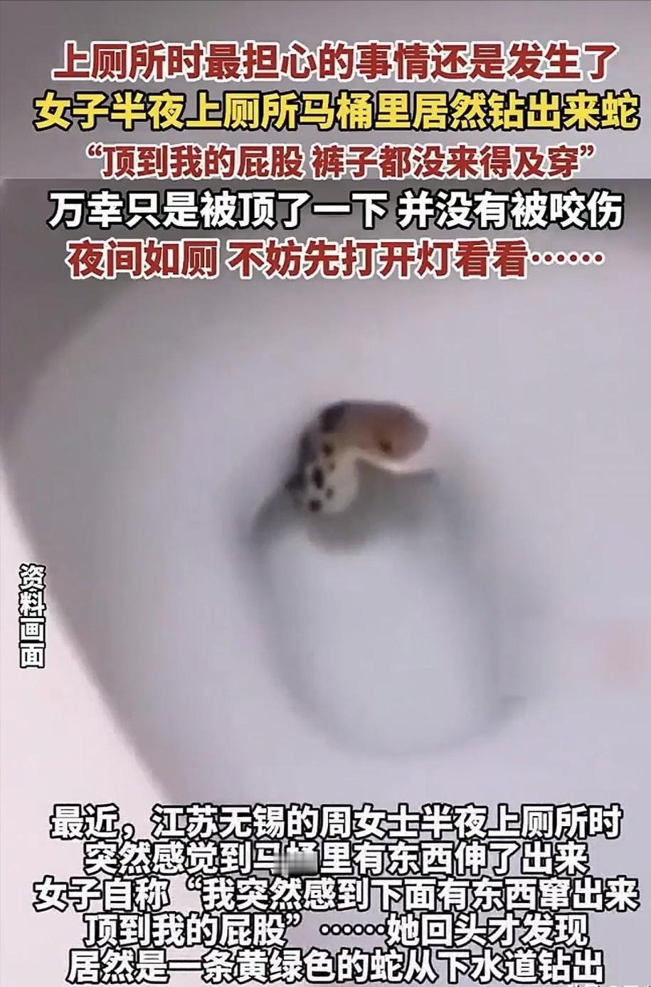 最担心的事还是发生了!10月20日报道,江苏,一女子晚上十一点多去上厕所,结果刚坐马桶没一会,她突然感觉到马桶里有东西伸了出来,还顶了一下她的屁股,起初她也不知道是什么东西,但当其回头一看时,直接吓得她惊叫连连,原来是马桶下水道里,钻出来一条黄绿色的蛇![舔屏] 江苏一位女士深夜11点多去卫生间,刚坐上马桶就感觉臀部被什么东西顶了一下,她以为是错觉,但几秒后那种异样触感又出现了,她转头一看,一条黄绿色的蛇正从马桶下水道里探出身子,蛇头已经蹭到了她的衣服。 女士当场吓得弹起来,连拖鞋都没穿就冲回卧室,她婆婆听到动静赶来,看到马桶里的蛇后立刻拿起马桶刷,趁蛇还没完全爬出来用力冲水,蛇被水流卷进下水道消失了,婆婆随后用消毒液把马桶和卫生间彻底清洁了一遍。 虽然女士没有被咬伤,但第二天还是去医院做了检查,确认身体无恙才放心。 这件事发到网上后,不少网友表示感同身受,有人说自己现在上厕所都要先开灯检查马桶,也有网友指出应该报警处理,防止蛇顺着下水道跑到其他住户家中。 蛇为什么会从马桶里钻出来?主要原因是老旧小区的下水道系统缺乏防护网,或者防护网已经损坏,蛇可以沿着污水管道或地下水道爬行,最终通过马桶下水口进入室内。 如果住宅靠近绿化带、河边或草丛,蛇类为了觅食、避暑或寻找水源,更容易沿着管道缝隙进入居民家。 这次事件中出现的黄绿色蛇,很可能是无毒的草蛇或游蛇,这类蛇喜欢潮湿环境,常在下水道附近活动,它们一般不会主动攻击人,受到惊吓后多数会自行退走。 除了蛇,下水道还可能爬出老鼠、蟑螂、蜥蜴等动物,去年广东有人半夜上厕所发现马桶里盘着小青蛇,前年浙江一位女士洗澡时浴室地漏爬出一条一米多长的蜥蜴,这些案例提醒我们要重视下水道的防护问题。 老旧小区的住户可以请物业在下水道关键位置加装防护网或滤网,这种防护网能有效阻挡体型较大的动物进入管道,同时不影响正常排水,,安装成本不高,但能大大降低类似事件发生的概率。 这次事件虽然有惊无险,但也是一次警示,卫生间看似安全的空间,实际存在一些容易被忽视的风险点,做好日常检查和维护,出现异常及时处理,才能真正保障居家安全。 网友热评: “救命!这蛇是坐火箭来的吗?半夜上厕所直接给我整出心理阴影了!” “老小区一楼真要小心了,建议每晚睡前先给马桶盖个防蛇罩!” “以前觉得'马桶有蛇'是段子,现在看评论区全是真实案例,吓得我连夜买了个马桶圈锁” “建议物业统一给下水道装防蛇网,这玩意比抓老鼠还重要!” “看到有人说'冲走蛇太残忍',但想想人家大半夜被顶屁股更惨啊!” “河南那个蝙蝠案例更吓人!这年头上厕所要带防护手套了?” 要是你家马桶突然钻出蛇/老鼠/蟑螂,你会选择直接冲走,还是找专业团队处理?评论区晒出你的'灭虫/灭蛇方案'! 信源:纵览新闻