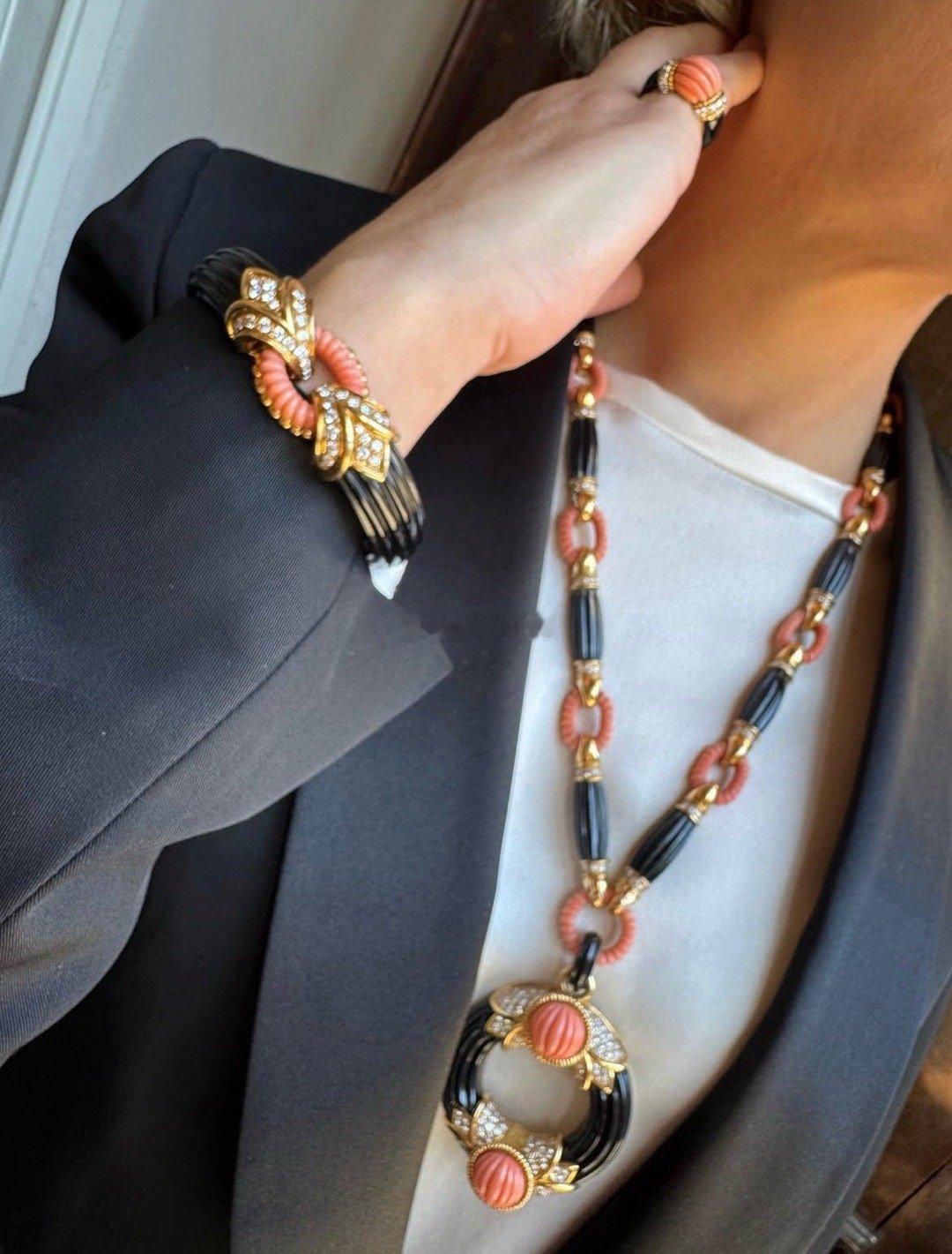 宝诗龙珊瑚玛瑙珠宝套组尽显1970年代复古风华,大胆的波希米亚风格捕捉了那个时代的自由精神。醒目的花卉造型吊坠与鲜明的链条设计,演绎着不羁的优雅。