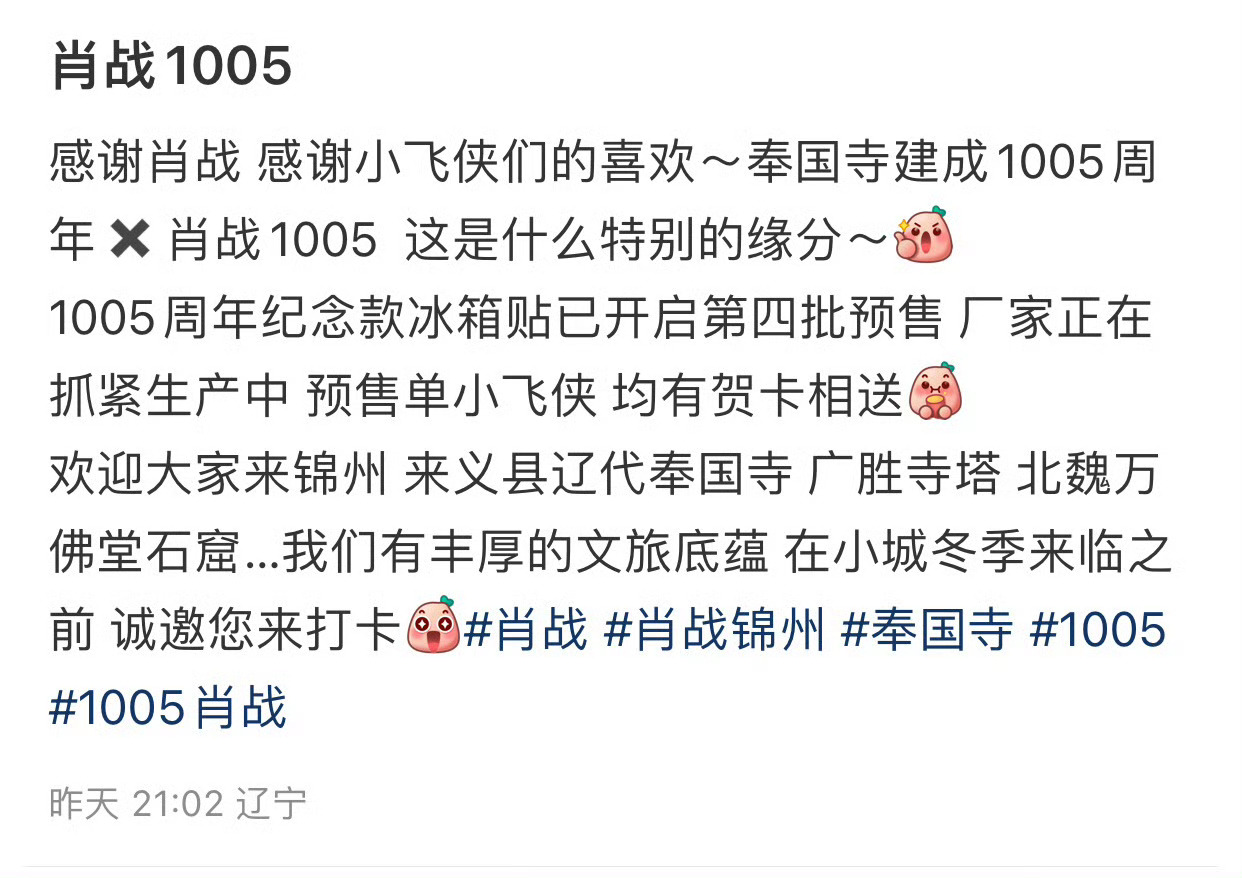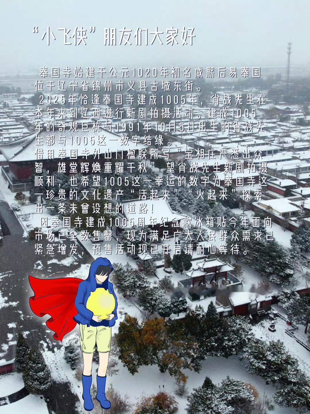 肖战生日数字与锦州奉国寺建寺“建成1005周年纪念日”重合,景区也成为热门打卡点! 锦州奉国寺文创冰箱贴已经卖断货了、目前已经开启了第四波预售!小城良方